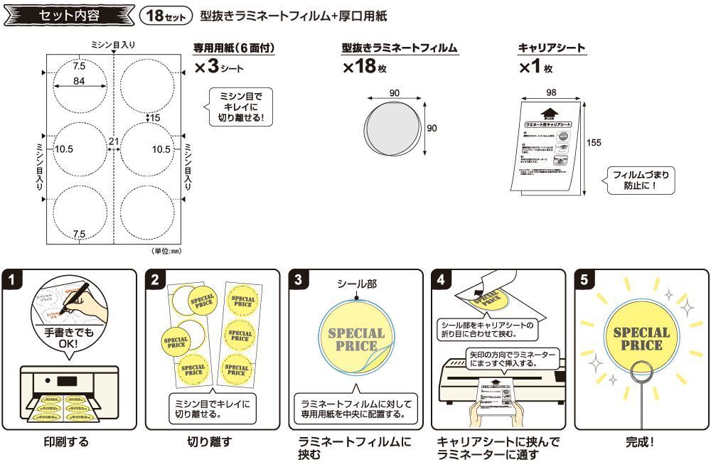 用紙とラミネートフィルムがセットになって、丸型のPOPが作成できるキットです。