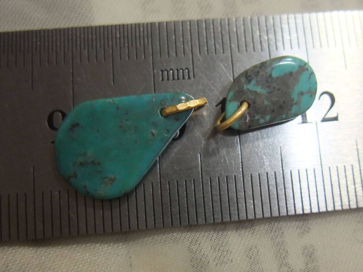 カンをつけてあるので、そのまま細い革紐を通したり、ピアス金具に付けたり、細いチェーンに通したり、素人の方でも簡単に使用していただけます♪ターコイズは本物で、アグネサイトやハウライトではなく、石の特性上エンハンス等加工はしていますが、高技術の仕上がりです。飽きのこない使いやすい、シンプルな高品質な半製品ものでお薦めです♪2個セットではありますが、ペアではないです。主にペア取りできなく残った在庫で、品質に問題の無いものを出品しています。でも、数点落札されれば、中にはギリ、ペアで使えるよう組めるかもしれないです。