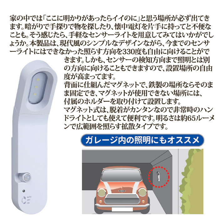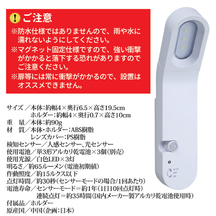 ・電池寿命:センサーモード/約1年(1日10回点灯時)、連続点灯/約35時間