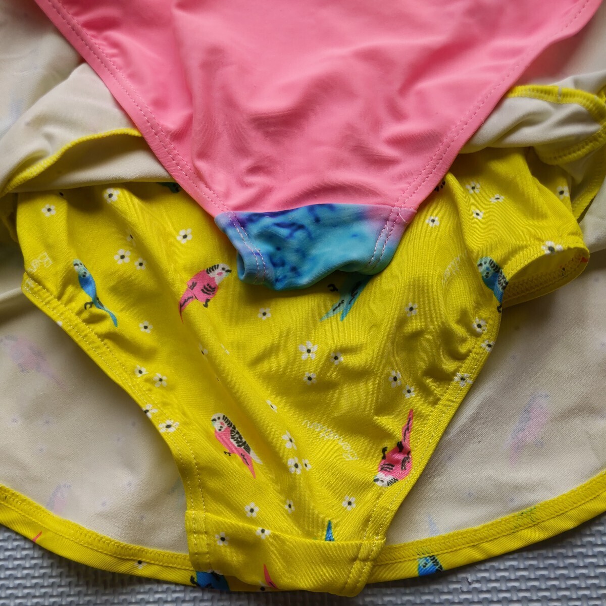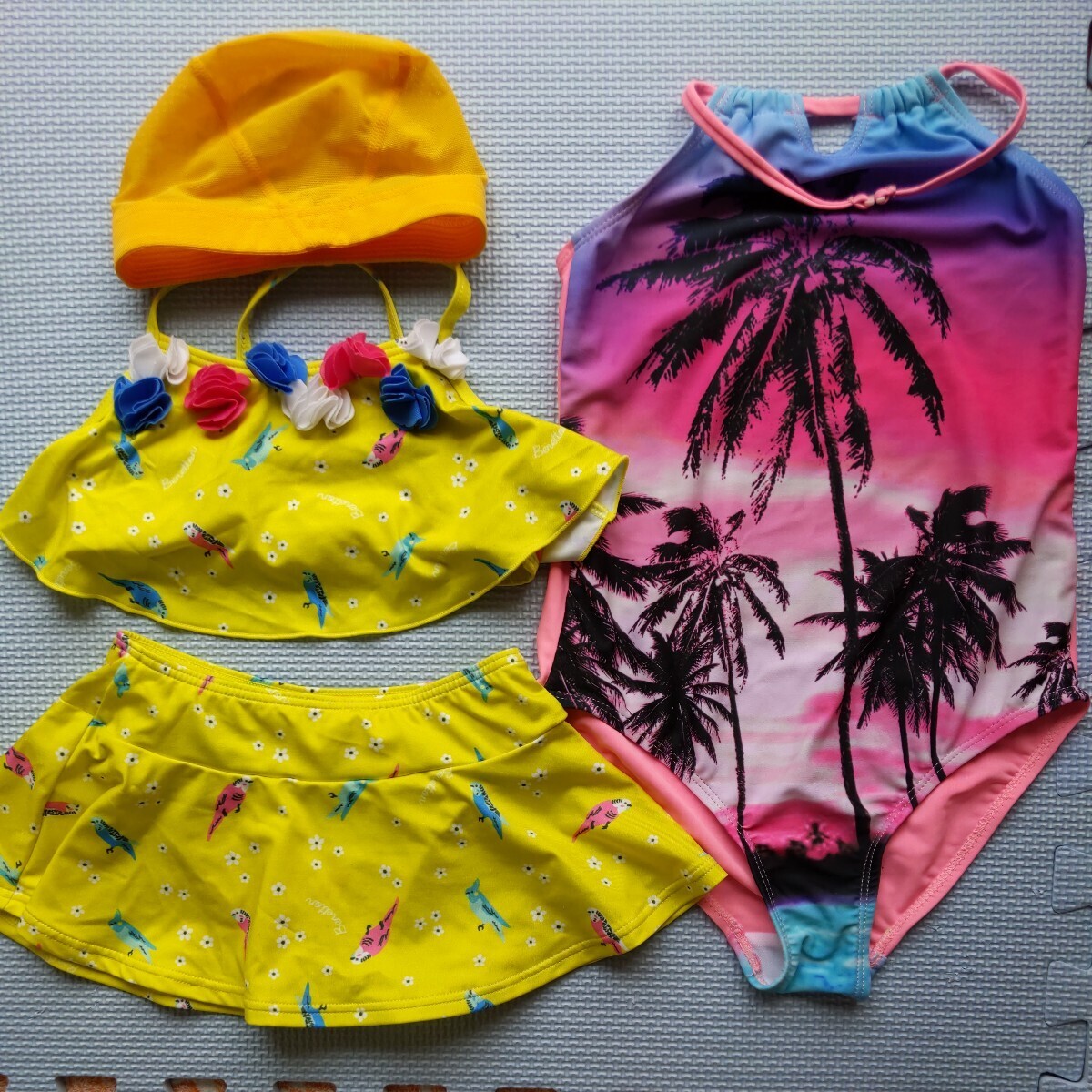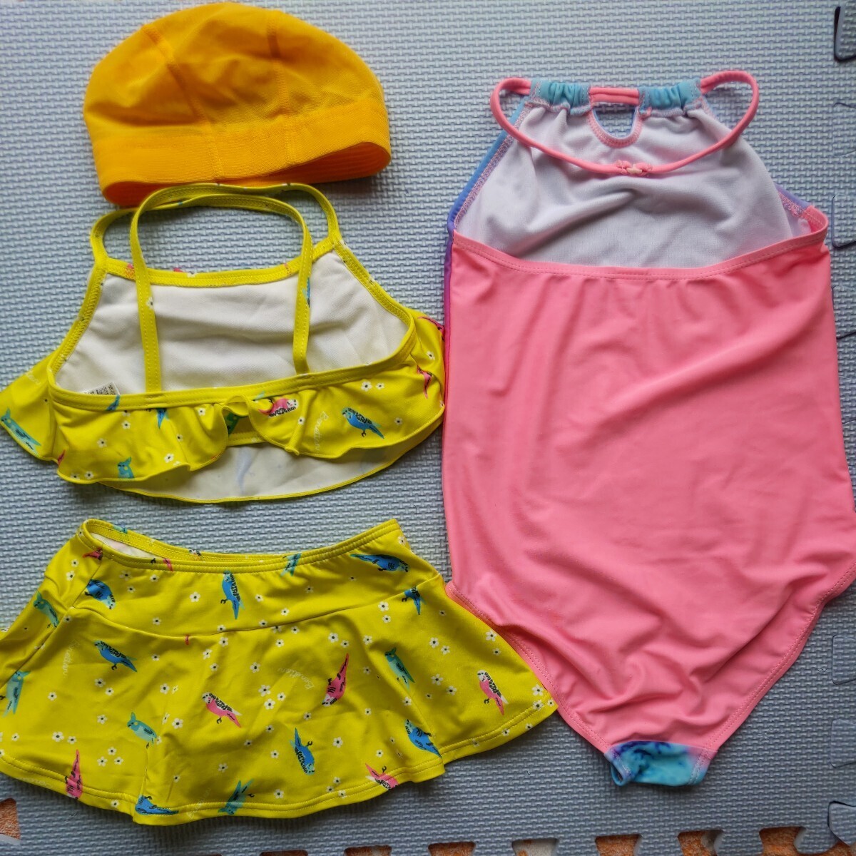 女子約120センチ Mサイズ? 海外製品のため詳細なサイズは不明 サンセットヤシの木柄のワンピースタイプのピンクの水着 こちらはヒモを首にかけて着るタイプでヒモの調節はできないようです。うちの子どもはヒモのタイプが違和感で気に入らなかったためあまり着用しませんでしたが、陽が沈む時の海の絵柄がとてもステキです。サイズ110センチのかわいいカラフルなインコと花柄の黄色セパレート、ビキニタイプ水着と黄色水着帽子48〜52センチ記名あり。 水着類はすぐにサイズアウトしてしまったので着用回数が少ないため状態は良いと思いますが、それなりに着用感はあります。