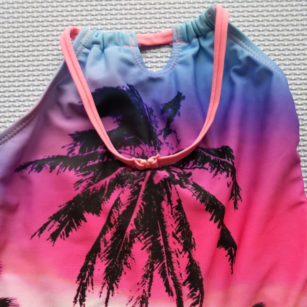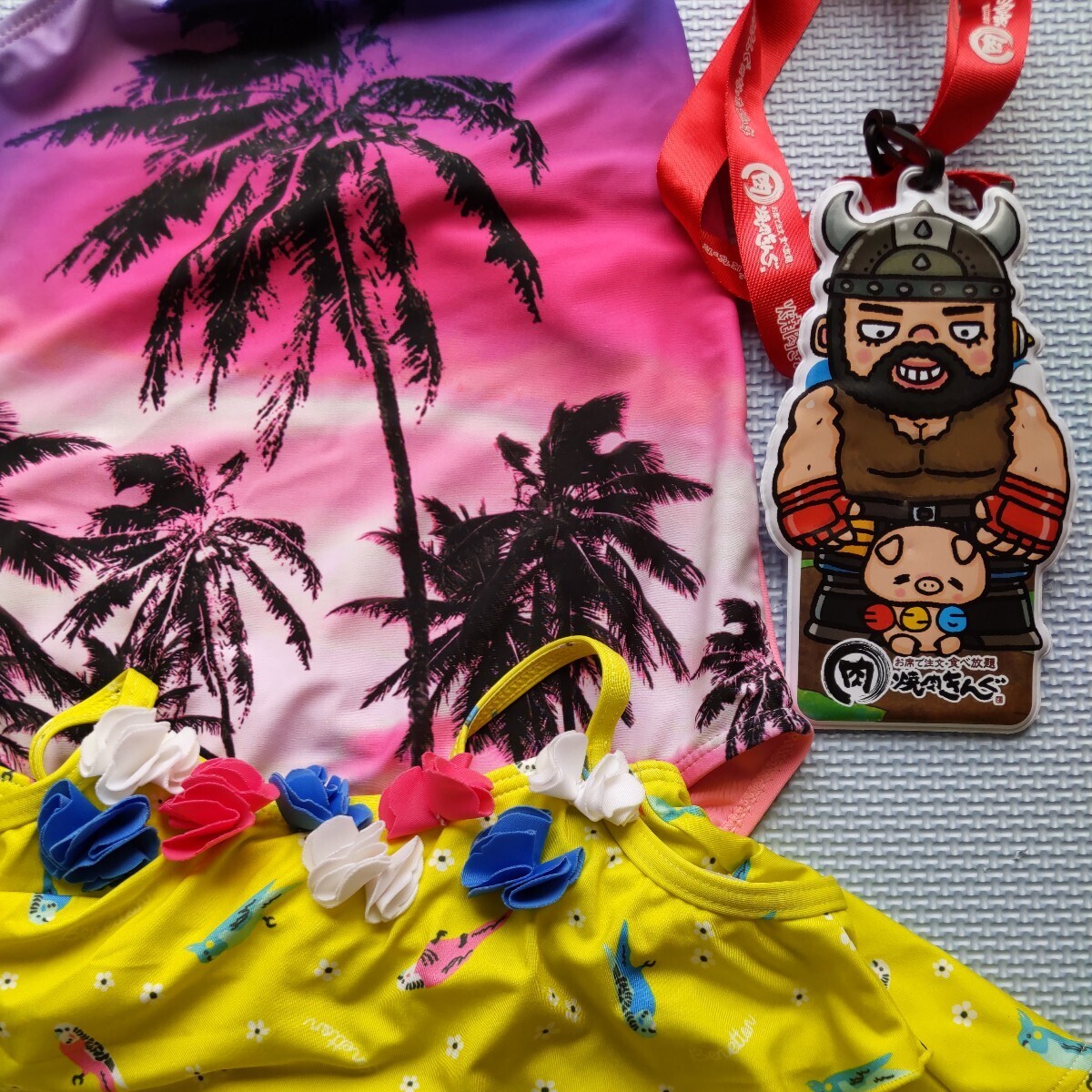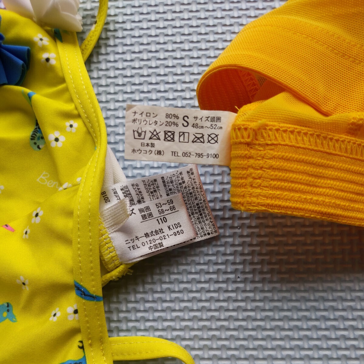 女子約120センチ Mサイズ? 海外製品のため詳細なサイズは不明 サンセットヤシの木柄のワンピースタイプのピンクの水着 こちらはヒモを首にかけて着るタイプでヒモの調節はできないようです。うちの子どもはヒモのタイプが違和感で気に入らなかったためあまり着用しませんでしたが、陽が沈む時の海の絵柄がとてもステキです。サイズ110センチのかわいいカラフルなインコと花柄の黄色セパレート、ビキニタイプ水着と黄色水着帽子48〜52センチ記名あり。 水着類はすぐにサイズアウトしてしまったので着用回数が少ないため状態は良いと思いますが、それなりに着用感はあります。
