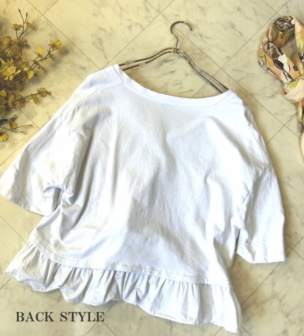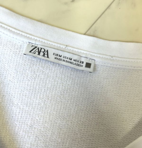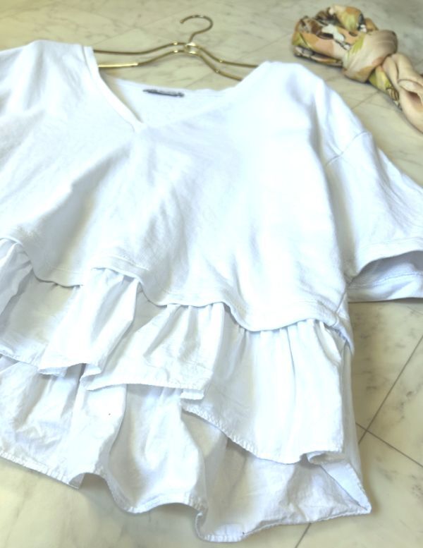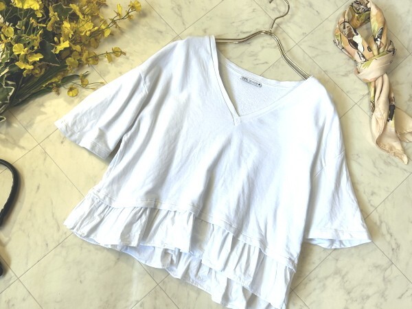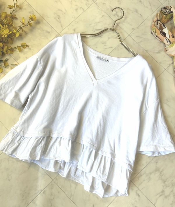 e434★ ZARA ザラ Tシャツ Vネック 白 ホワイト 半袖 裾 フリル フレアー Aライン レディース トップス ホワイトコーデ 春夏 重ね着