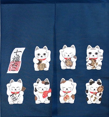 暖簾 のれん 85X90cm ポリエステル100%「七福ねこ 紺色 」【日本製】85x90cm