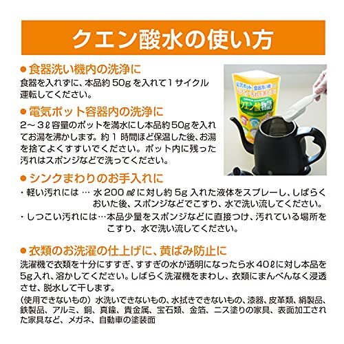 「紀陽除虫菊 クエン酸物語 (お徳用600g×3個セット / ナチュラル洗浄剤) 粉末タイプ 電気ポット ケトル 湯垢 水垢掃除 マルチクリーナー」▼4971902920450▼(商品説明)・ 600グラム (x 3) ・【酸性タイプのナチュラル洗浄剤】合成界面活性剤を使用しない安心・安全のクエン酸です。酸性なのでアルカリ性の汚れを中和して分解できるクエン酸は、水周りや水筒などの水垢取りや、汚れ落とし、お洗濯の仕上げの黄ばみ防止に最適です。保管に便利なチャック付。・【こんな用途にお使いいただけます】・食器洗い機内の洗浄に ・電気ポットのお掃除に ・シンク周りのお掃除に ・水筒などの水アカ湯アカ落としに ・お洗濯の仕上げに ・鏡の曇りとりに ・蛇口の水アカ取りに・【ご使用方法】・クエン酸スプレー : 水200mlに本品約5gをとかしてスプレーボトルに入れて使用します。蛇口の水アカとりは、クエン酸スプレーを吹きかけてラップをかけておいた後に水で洗い流します。 ・食器洗い機内の洗浄に : 食器を入れずに、本品約50gを入れて1サイクル運転してください。・【使用上のご注意】・食品ではありません。 ・クエン酸は食品添加物につき食品衛生上無害ですが、酸性のため塩素系の製品と併用しないようご注意ください。 ・荒れ性の方は炊事用手袋をしてご使用ください。・【商品詳細】説明 商品の説明 【酸性タイプのナチュラル洗浄剤】 合成界面活性剤を使用しない安心・安全のクエン酸です。 酸性なのでアルカリ性の汚れを中和して分解できるクエン酸は、 水周りの水垢取りや、汚れ落とし、お洗濯の仕上げの黄ばみ防止に最適です。 保管に便利なチャック付。 【こんな用途にお使いいただけます】 ・食器洗い機内の洗浄に ・電気ポットの洗浄に ・シンク周りの洗浄に ・水アカ 湯アカ落としに ・お洗濯の仕上げに ・鏡の曇りとりに ・蛇口の水アカ取りに 【ご使用方法】 ・クエン酸スプレー : 水200mlに本品約5gをとかしてスプレーボトルに入れて使用します。 蛇口の水アカとりは、クエン酸スプレーを吹きかけてラップをかけておいた後に水で洗い流します。 ・食器洗い機内の洗浄に : 食器を入れずに、本品約50gを入れて1サイクル運転してください。 【使用上のご注意】 ・食品ではありません。 ・クエン酸は食品添加物につき食品衛生上無害ですが、酸性のため塩素系の製品と併用しないようご注意ください。 ・荒れ性の方は炊事用手袋をしてご使用ください。 【商品詳細】 ・内容量 : 600g×3個セット ・商品サイズ:約235×143×70mm×3個セット ・成分 : クエン酸(無水)99%以上 ・液性 : 酸性 ・原産国 : 日本 原材料・成分 クエン酸(無水)