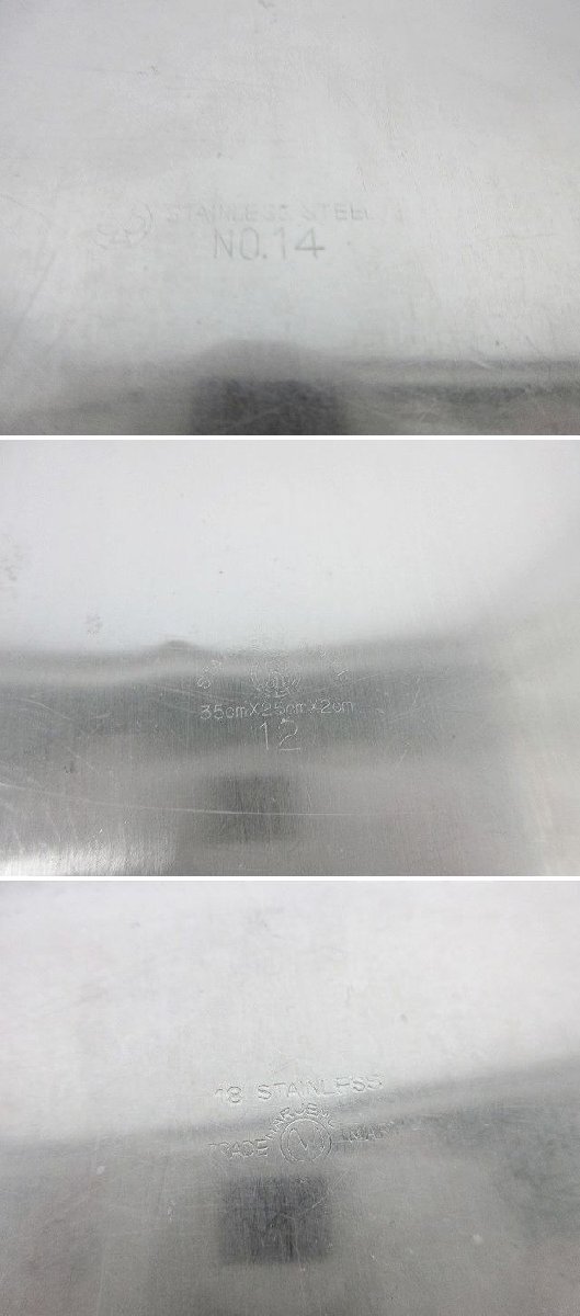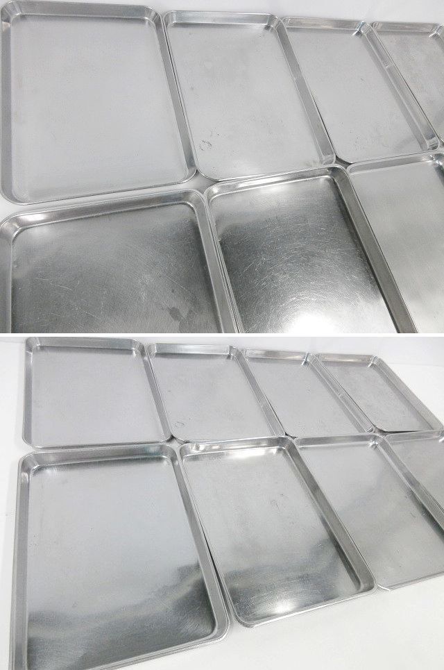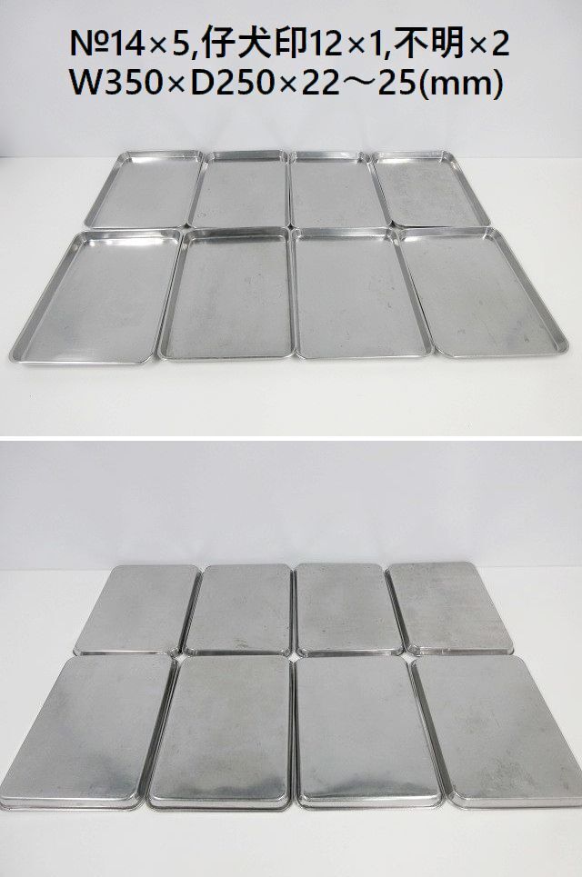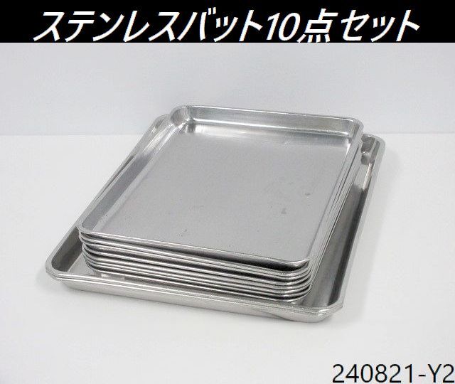 | ※送料はお客様負担となります※ ステンレスバット、10点セットです。 仔犬印の大サイズ×2点とクローバー製のNo.14×5点、仔犬印12サイズ×1点、他不明が×3点になります。 丈夫なステンレス製でできているので、耐久性・耐食性・耐熱性に優れています。 10点セットでの販売となり、ばら売りは対応しておりません。 寸法は当方が手作業にて計っております。多少の誤差はご容赦ください。 商品の現物確認や直接のお引取りも大歓迎です。お気軽にお問い合わせ下さい。 ◆仕様
