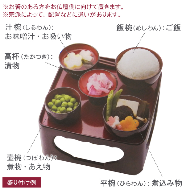 | 商品説明 | 【商品コード:2311】 ■商品詳細 ●寸法:奥行18cm×幅21cm×高さ11.8cm(器をセットした時の総寸法) ●重量:367g ●材質: お椀:ABS樹脂/ウレタン塗装 お膳:ABS樹脂/ウレタン塗装 お箸:木製/ウレタン塗装 お盆・お彼岸・祥月命日・お正月等に御仏前にお供えいただくお膳のセットです。 ご飯・汁物・煮物・和え物・香の物をそれぞれの決まった器に入れてお供えします。 PC(プラスチック)製なので取り扱いやすく、お手入れも楽です。 また、別売りで仏膳用の惣菜セット「ご先祖様」もございます。 フリーズドライ加工で電子レンジもOK!仏さまにお供えする精進料理が手間いらずに出来ます。 | |
