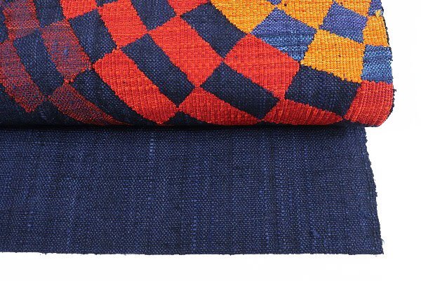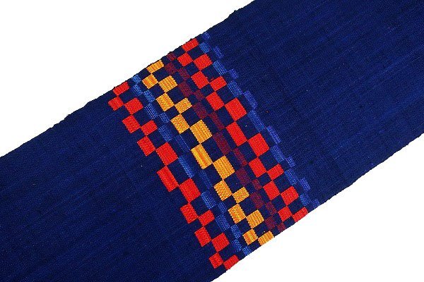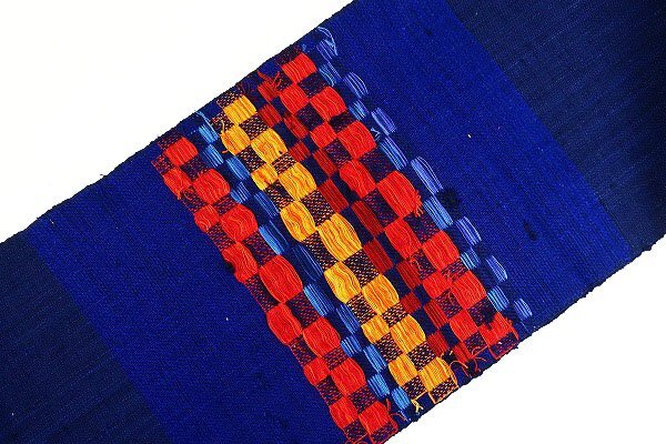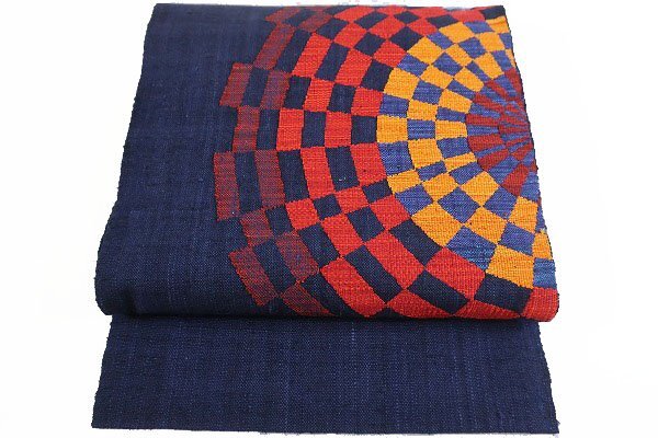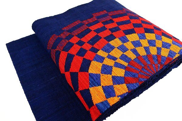 紺の紬地に、車輪柄が色分けで織られた名古屋帯です。 紺地に鮮やかな柄が映える、インパクトのある一本です。 未使用品です。 |
