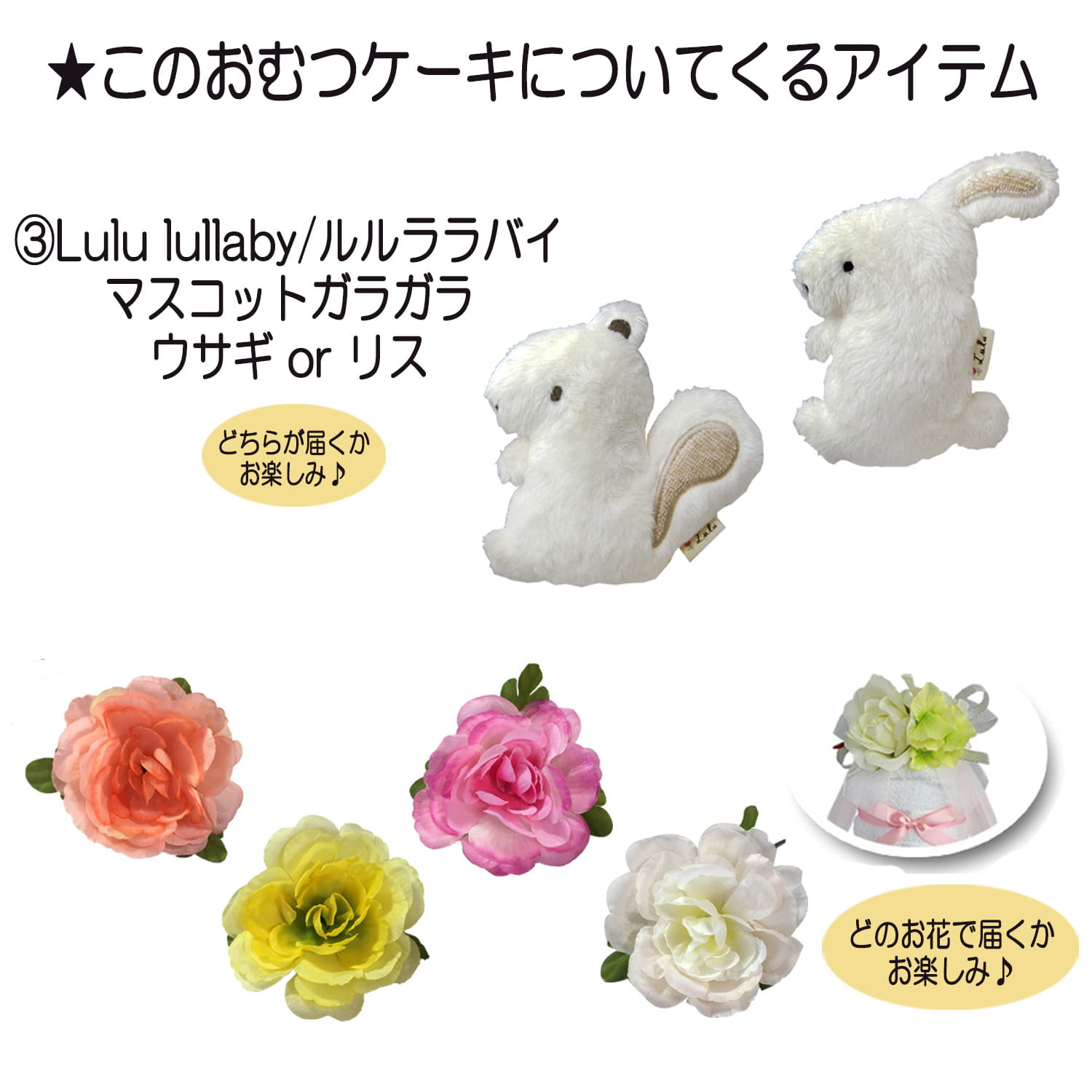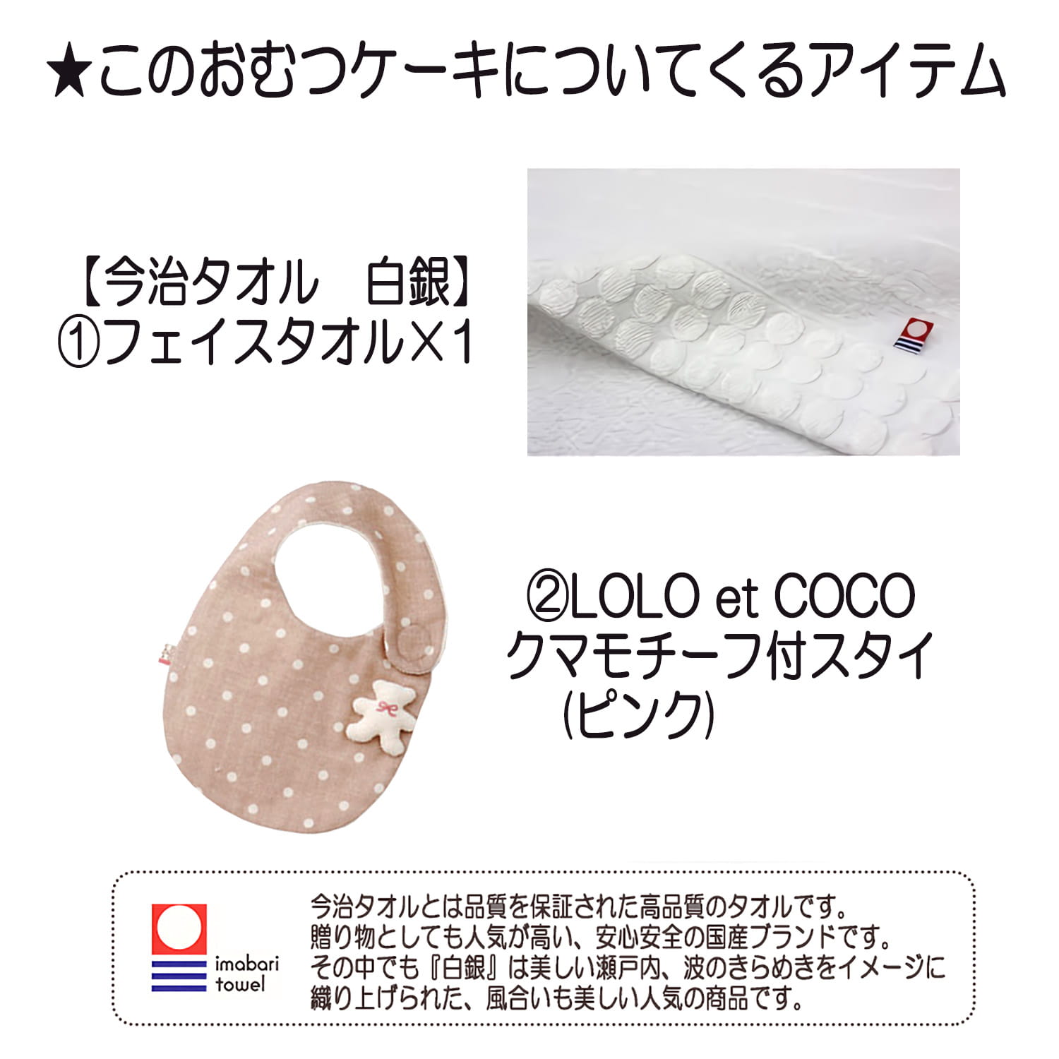 ●今治タオル 白銀 フェイスタオル×1 ●LOLOetCOCO クマモチーフ付スタイ×1 ●Lulu lullaby/ルルララバイ マスコットガラガラ×1 ●パンパース テープSサイズ 22枚 or Mサイズ 19枚 ●デザインギフトボックス ●メッセージカード ●ギフトラッピング ●造花 ※造花、リボンのお色は弊社スタッフのコーディネートになりますので、画像とは異なる場合がございます |