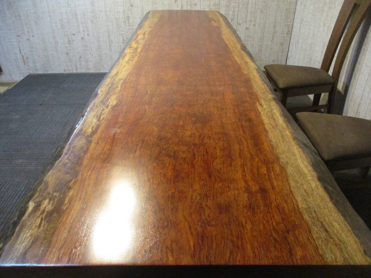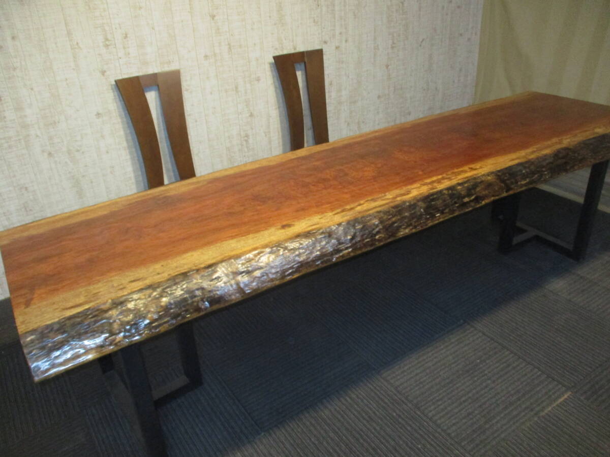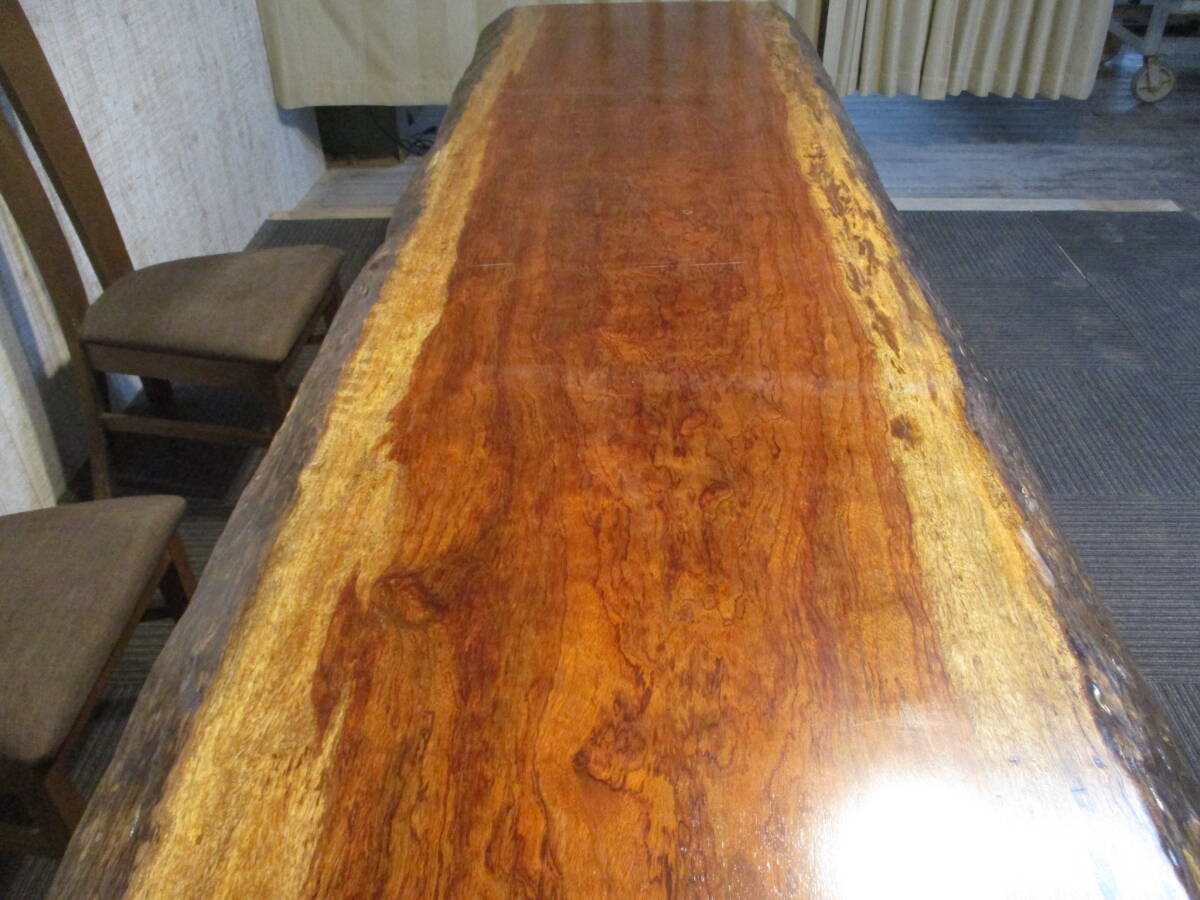 ブビンガの一枚板無垢のテーブルです。ワシントン条約で輸入禁止になった材木です。世界銘木中の銘木です。もともと稀少材で、高級テーブルとして取り扱われてきました。目立つ大きな節や節穴はありません。サイズはご希望に合わせてカットできます。なお、きれいに最終仕上げをしてお届けします。重量はかなりあります。