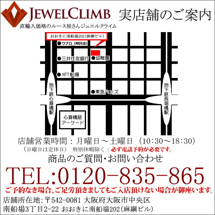 | ◆当店では 天然石のダイヤモンド、ルビー、サファイア、エメラルドなど、世界中の希少な宝石を直輸入価格にて販売しております。 ルースも、後から加工も可能です。 指輪やリングは勿論のこと、ペンダント・ネックレス・イヤリング・ピアス・ボディピアス等 あらゆるジュエリー、アクセサリーの制作をお承っております。 オリジナルジュエリーをとても簡単に作成が出来ます。初心者の方でもお気軽にご相談くださいませ。 ![]() |