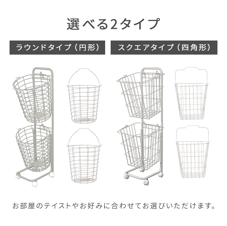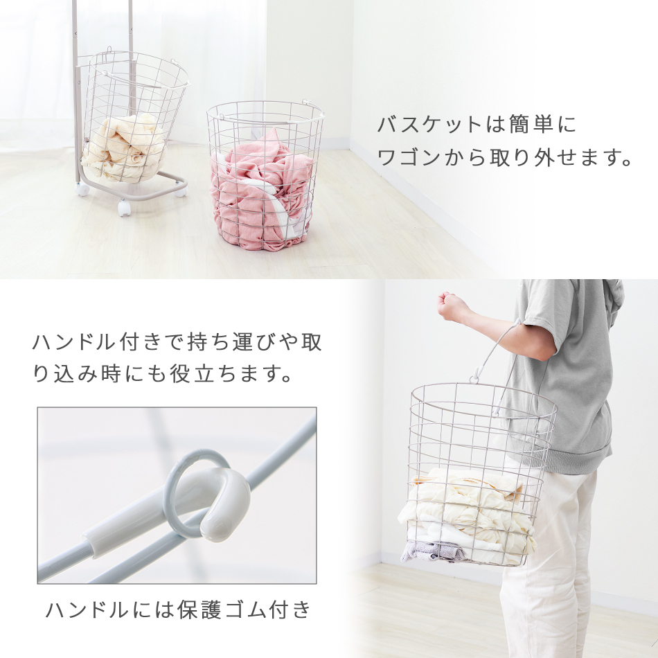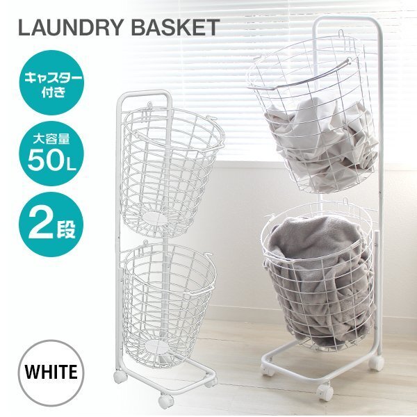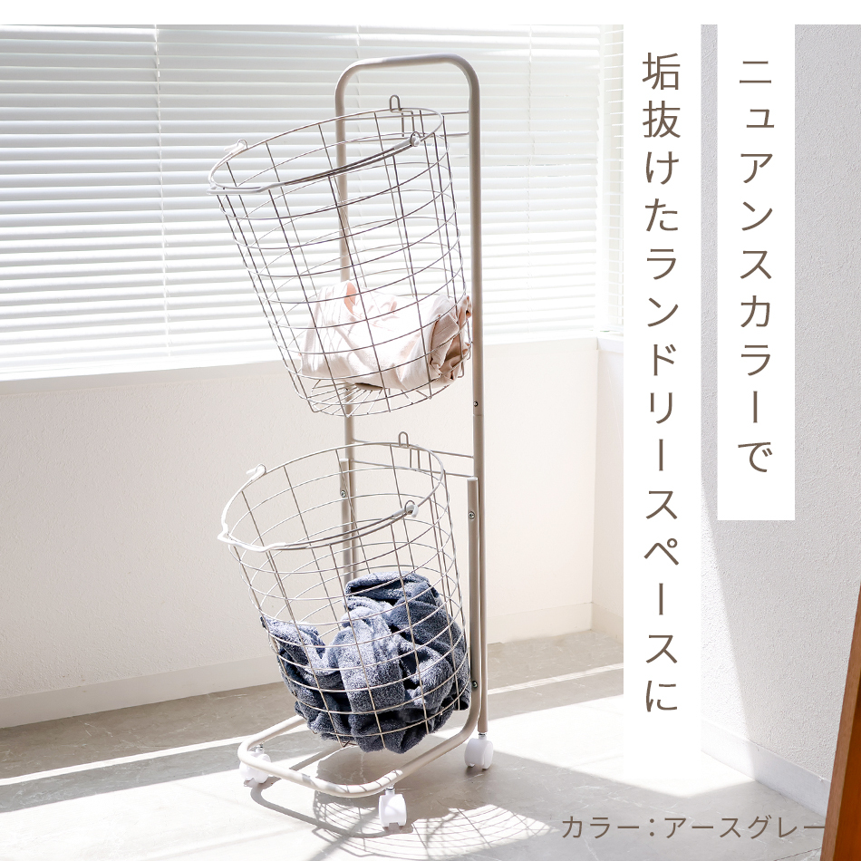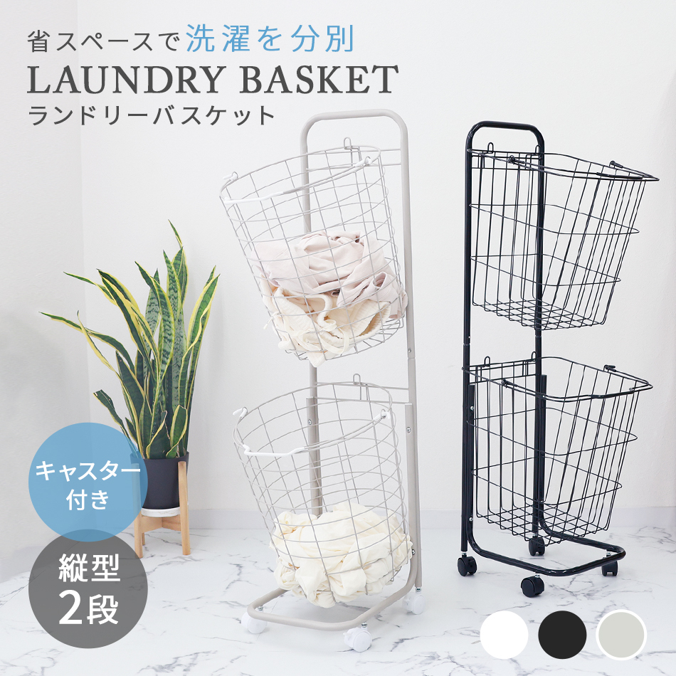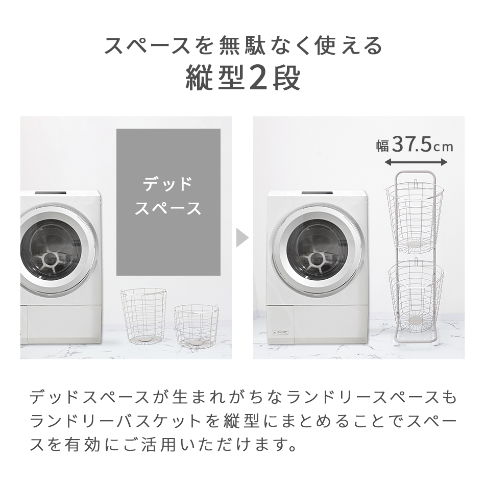| ランドリースペースを無駄なく使える! 縦置き2段タイプ大容量「ランドリーバスケット」です。 2つのバスケットを縦に並べるので、 デッドスペースを活用でき物が多くなりがちなランドリー周りも無駄なくすっきり♪ バスケットは取り外し可能&持ち手付きで洗濯物の持ち運び・取り込みに便利です! また、キャスター付きでラックごとの移動もスムーズです。 通気性抜群のワイヤーフレーム採用! 嫌にニオイや湿気が溜まりにくく、カビ等も発生しにくいです。 ランドリー以外に食品ストッカー、雑貨入れ、おもちゃ収納としても大活躍です☆ 【商品仕様】 カラー:ホワイト 形:ラウンド(円形) サイズ(外寸):(約)幅37.5×高さ107×奥行37cm 重量(約):3kg 容量(約):25L×2 耐荷重(約):10kg 素材:スチール、ナイロン |