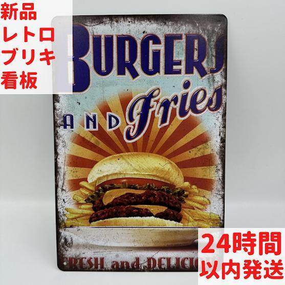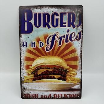 "このブリキ看板は、バーガーとフライドポテトのデザインが魅力的なレトロ感を演出します。