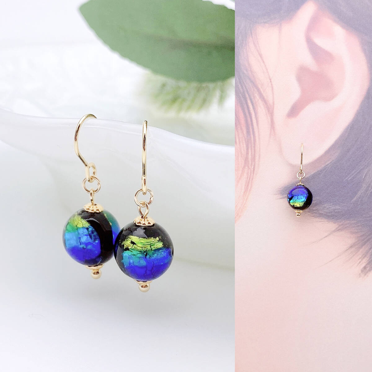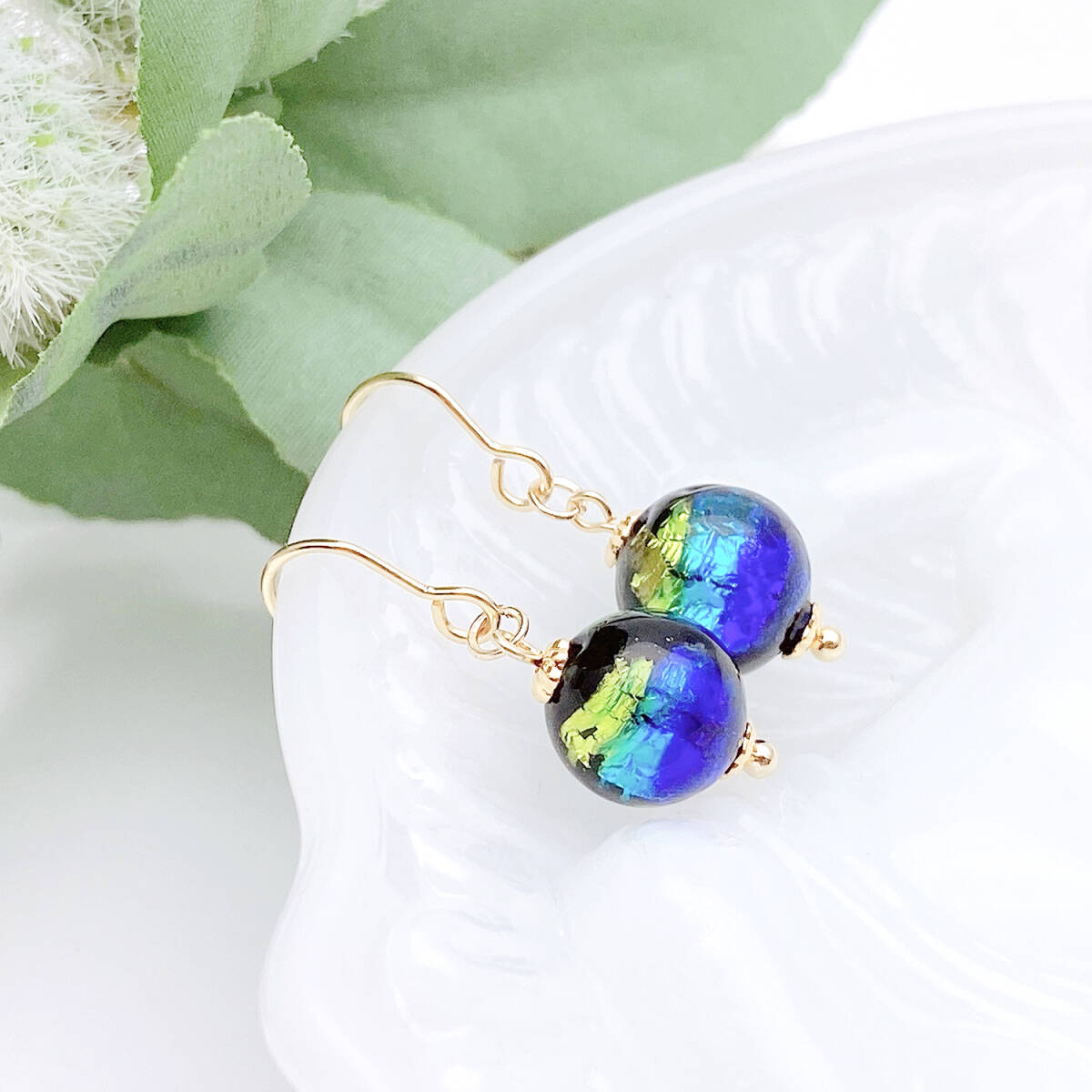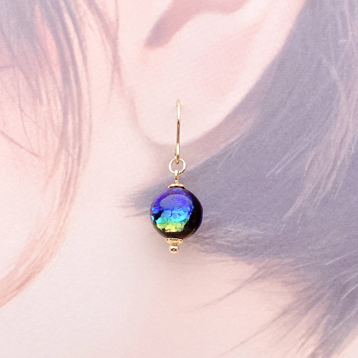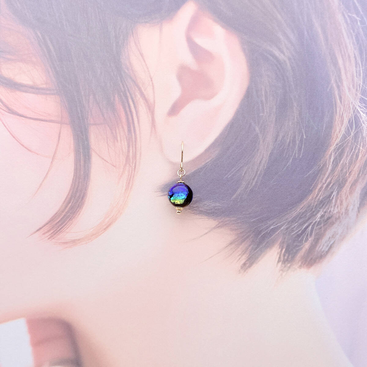 様々な種類があるとんぼ玉の中でも【ホタルガラス】と呼ばれるビーズで、ブラックのベースに銀箔とブルー~イエローのガラスを重ね、この美しい色合いを表現しています。