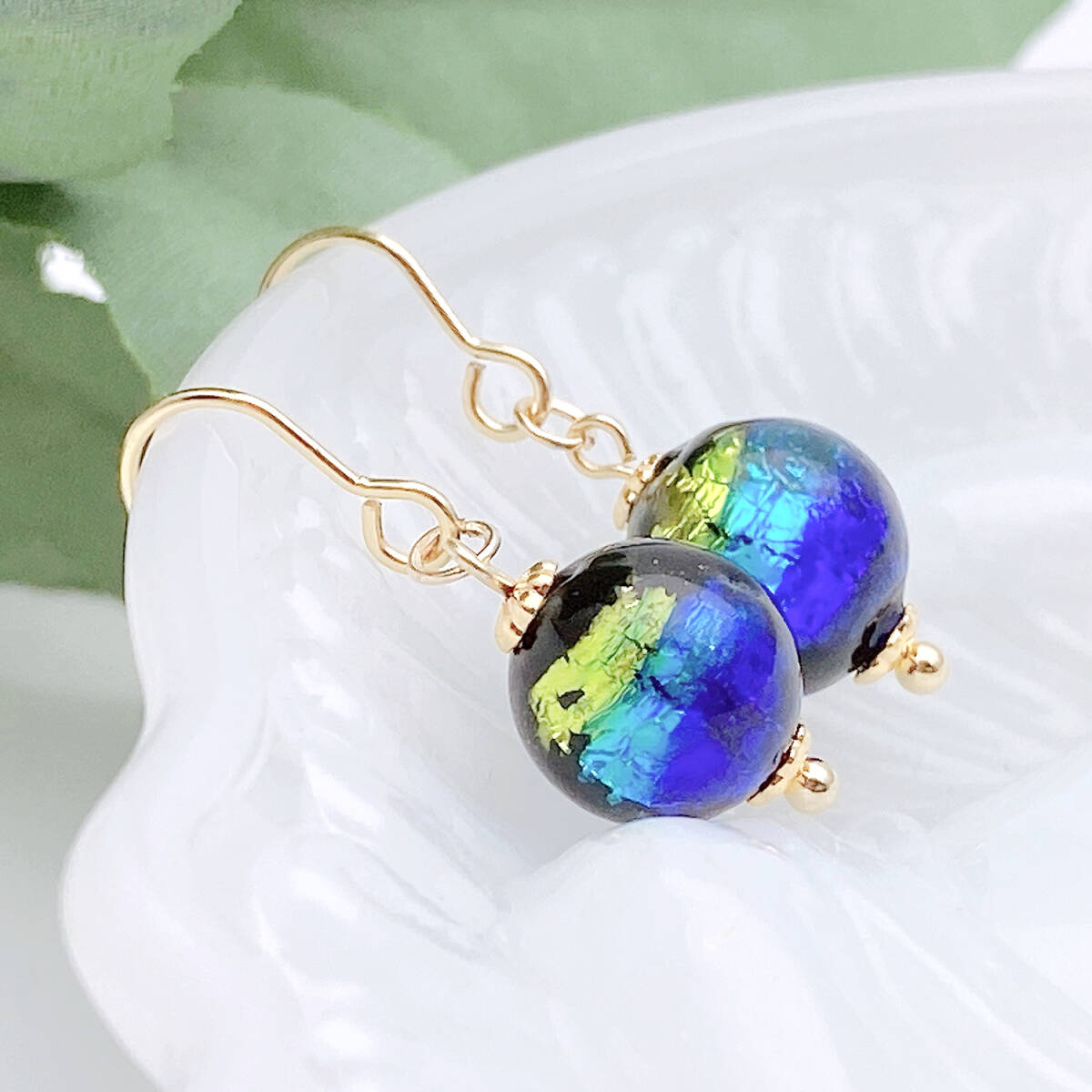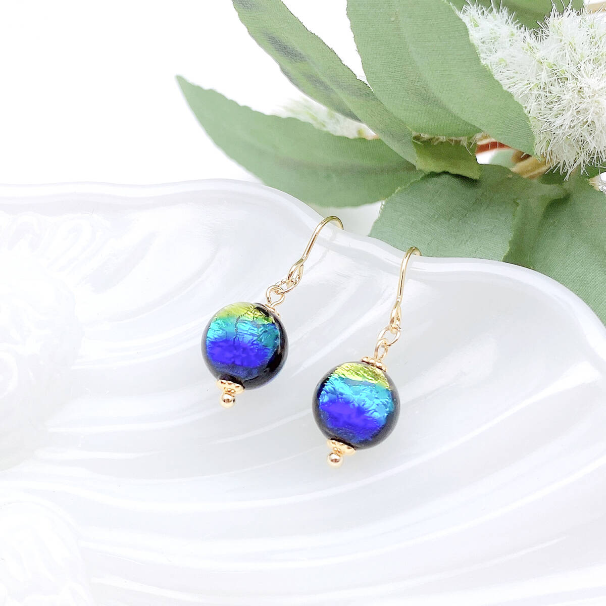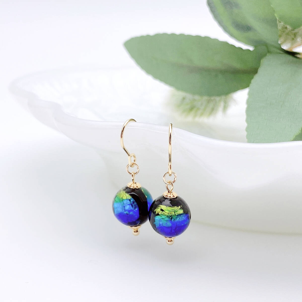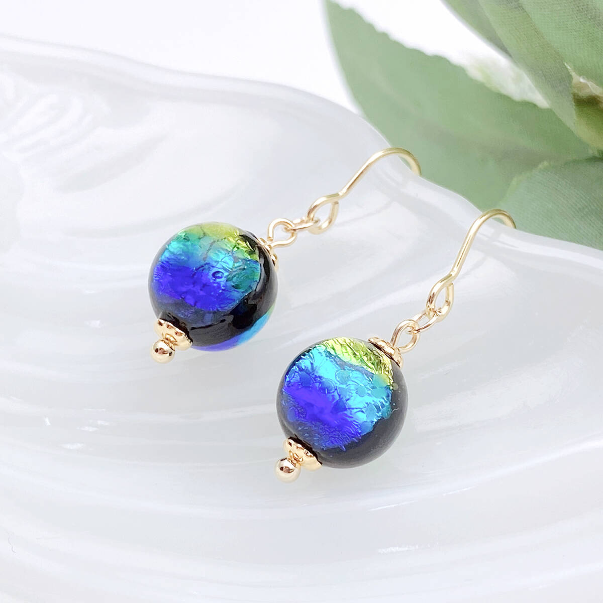 様々な種類があるとんぼ玉の中でも【ホタルガラス】と呼ばれるビーズで、ブラックのベースに銀箔とブルー~イエローのガラスを重ね、この美しい色合いを表現しています。