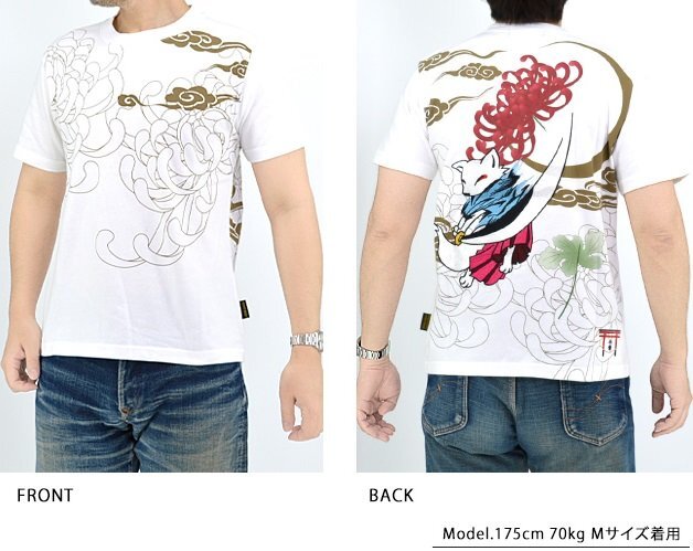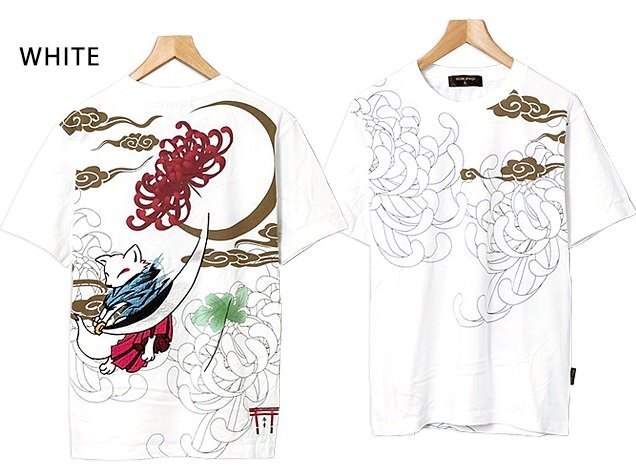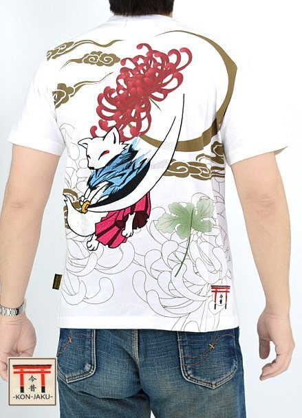 「狐の修行」半袖Tシャツ◆今昔 ホワイトXLサイズ KJ-26020 和柄 和風 きつね キツネ こんじゃく