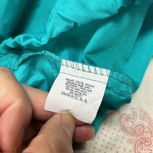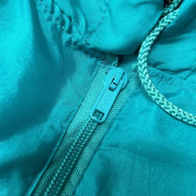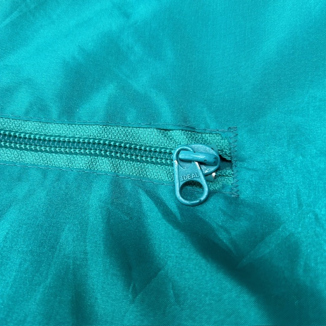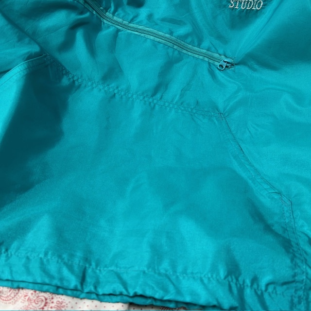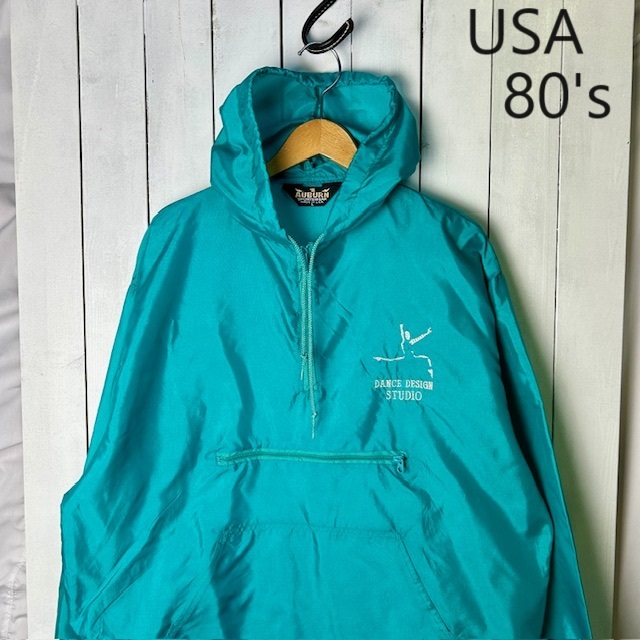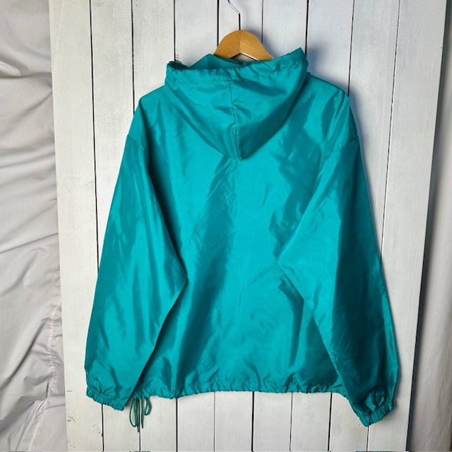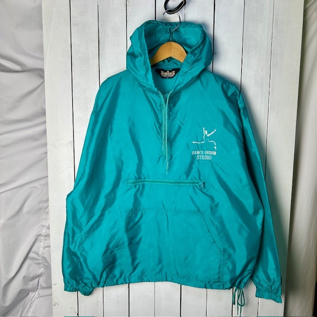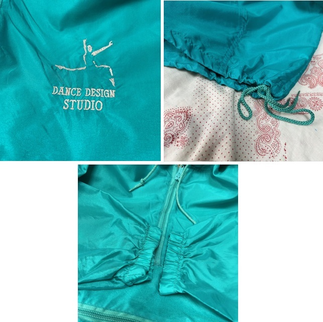 ●商品説明・・・アメリカ古着になります。80年代頃のオールド・ヴィンテージのナイロンの一枚シェルの薄手の季節問わず幅広いシーズン使っていただけるアノラックパーカーです。ジップはIDEALで、フロントポケットがジップ付きとハンドポケットの2つあります。裾はサイドのドローコードで絞れるようになっています。ダンススタジオの刺繍ロゴがはいっています。made in USA (アメリカ製)です。素材はナイロンで、色はやや光沢感のあるエメラルドグリーンのような感じです。USAのL表記で、ゆったり大きめなL~XL程度のサイズ感かと思います。