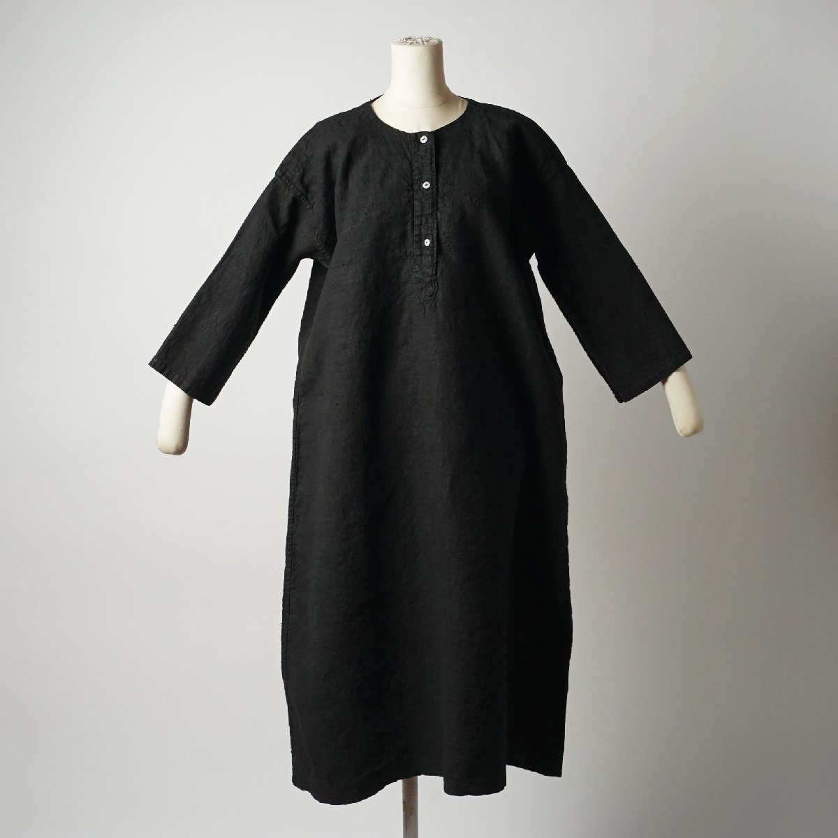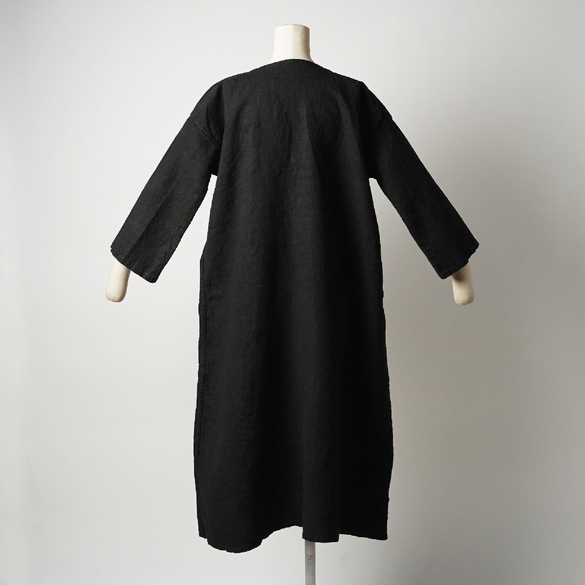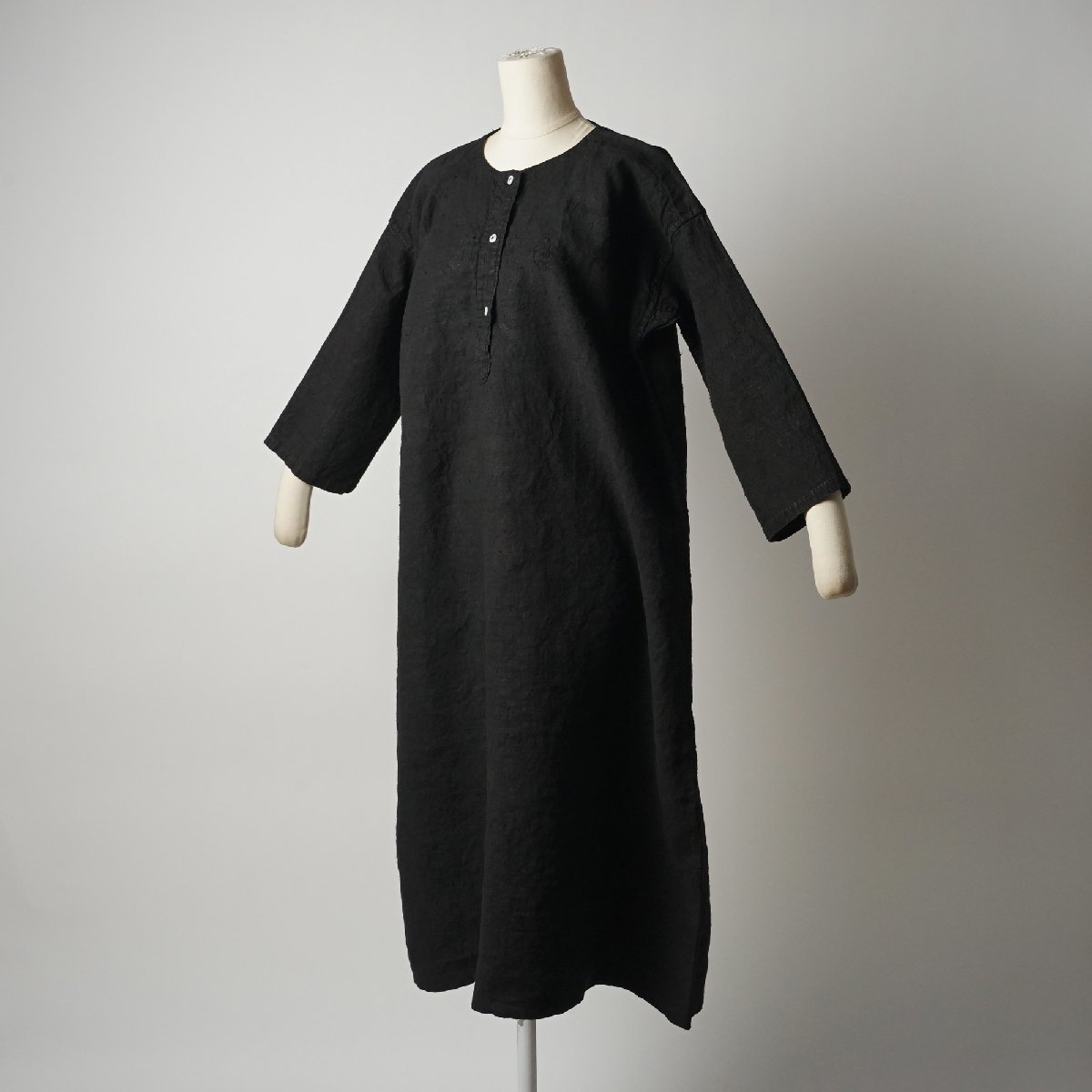 ○素材:フランス アンティーク ワンピースを当店でブラックカラーに後染めを施しました。しっかりした質感のリネン素材です。前上部はボタンで閉じるデザインです。裾淵は裁ち切り処理になっています。 左胸にイニシャルの刺繍があります。フランス購入品です。