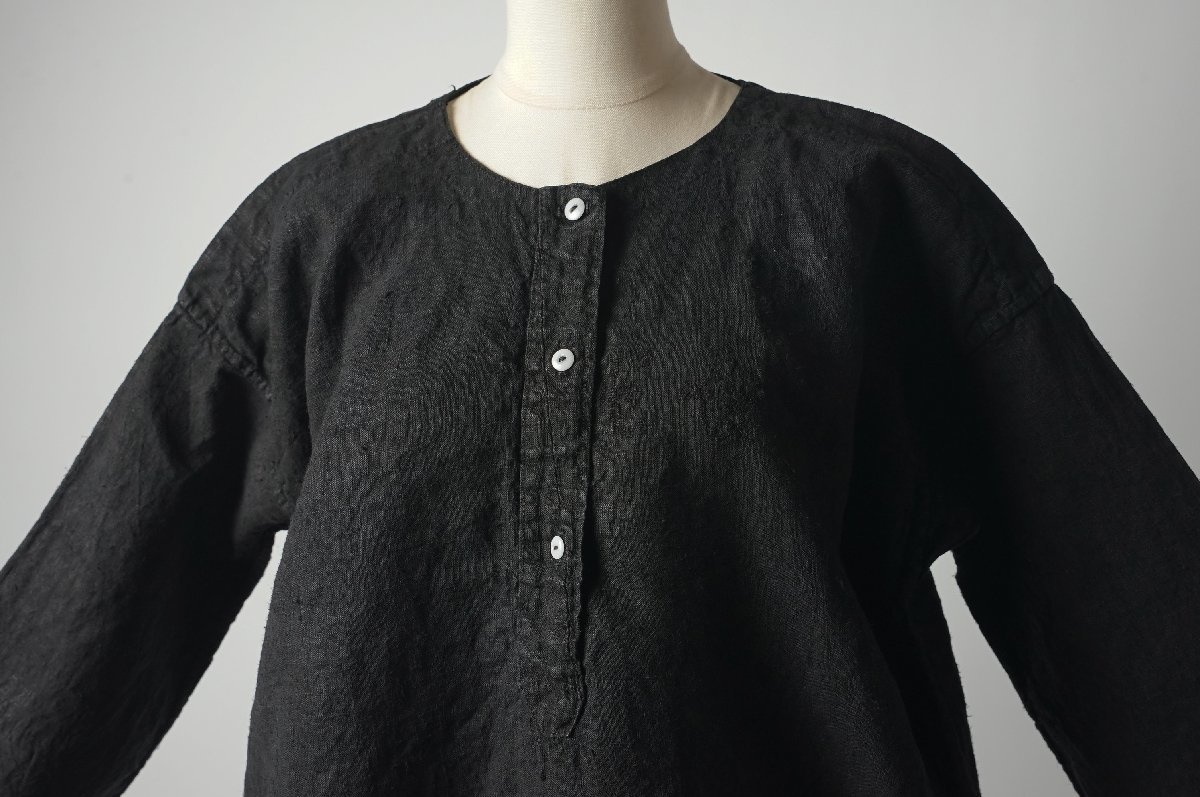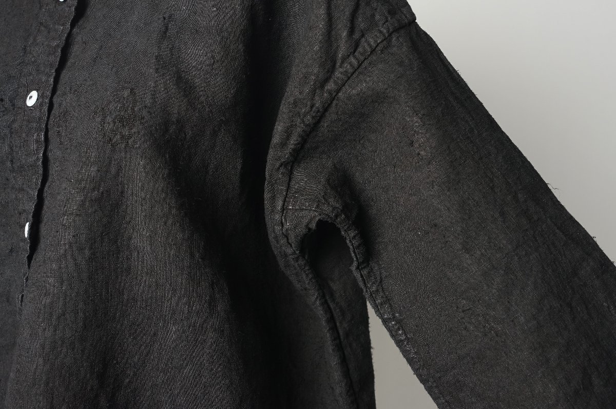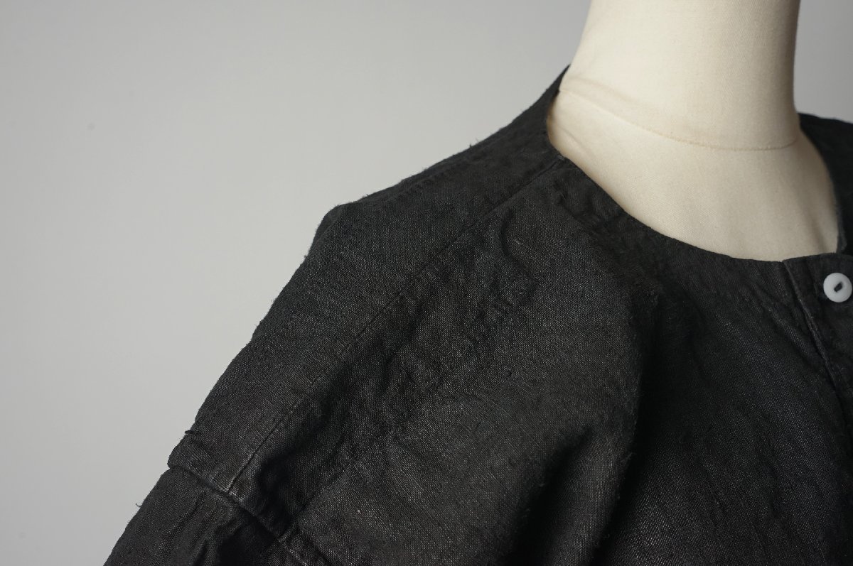 ○素材:フランス アンティーク ワンピースを当店でブラックカラーに後染めを施しました。しっかりした質感のリネン素材です。前上部はボタンで閉じるデザインです。裾淵は裁ち切り処理になっています。 左胸にイニシャルの刺繍があります。フランス購入品です。