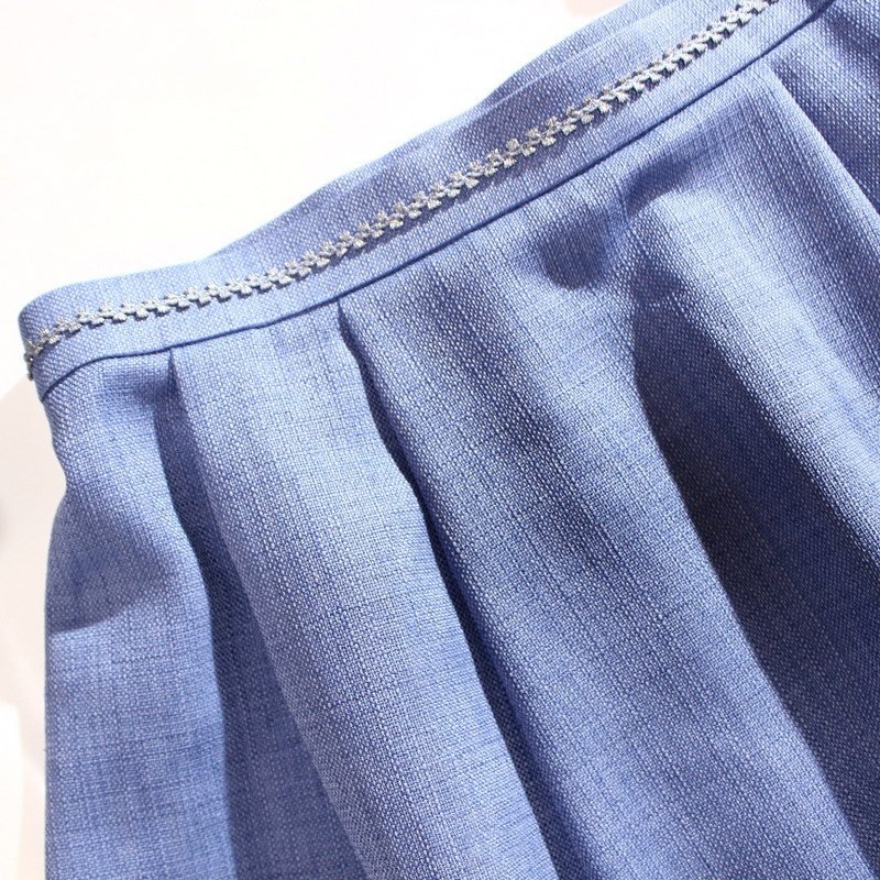 ほんのり艶感のあるシワになりにくいポリエステル素材、ウエストにラメ混合刺繍レースの飾りライン、上品清楚、軽やか、ファスナーは左側、綺麗めデザインです。