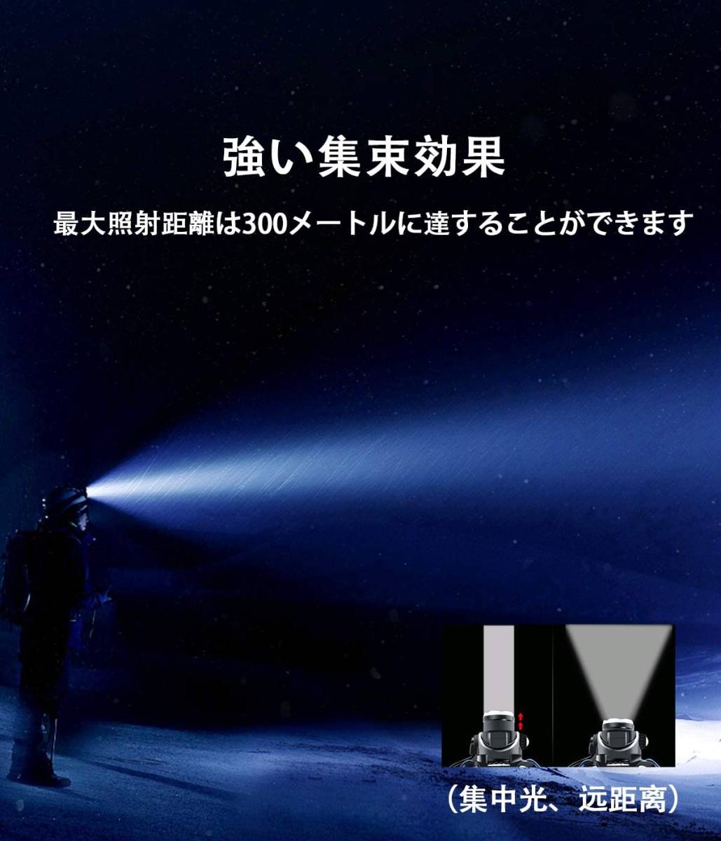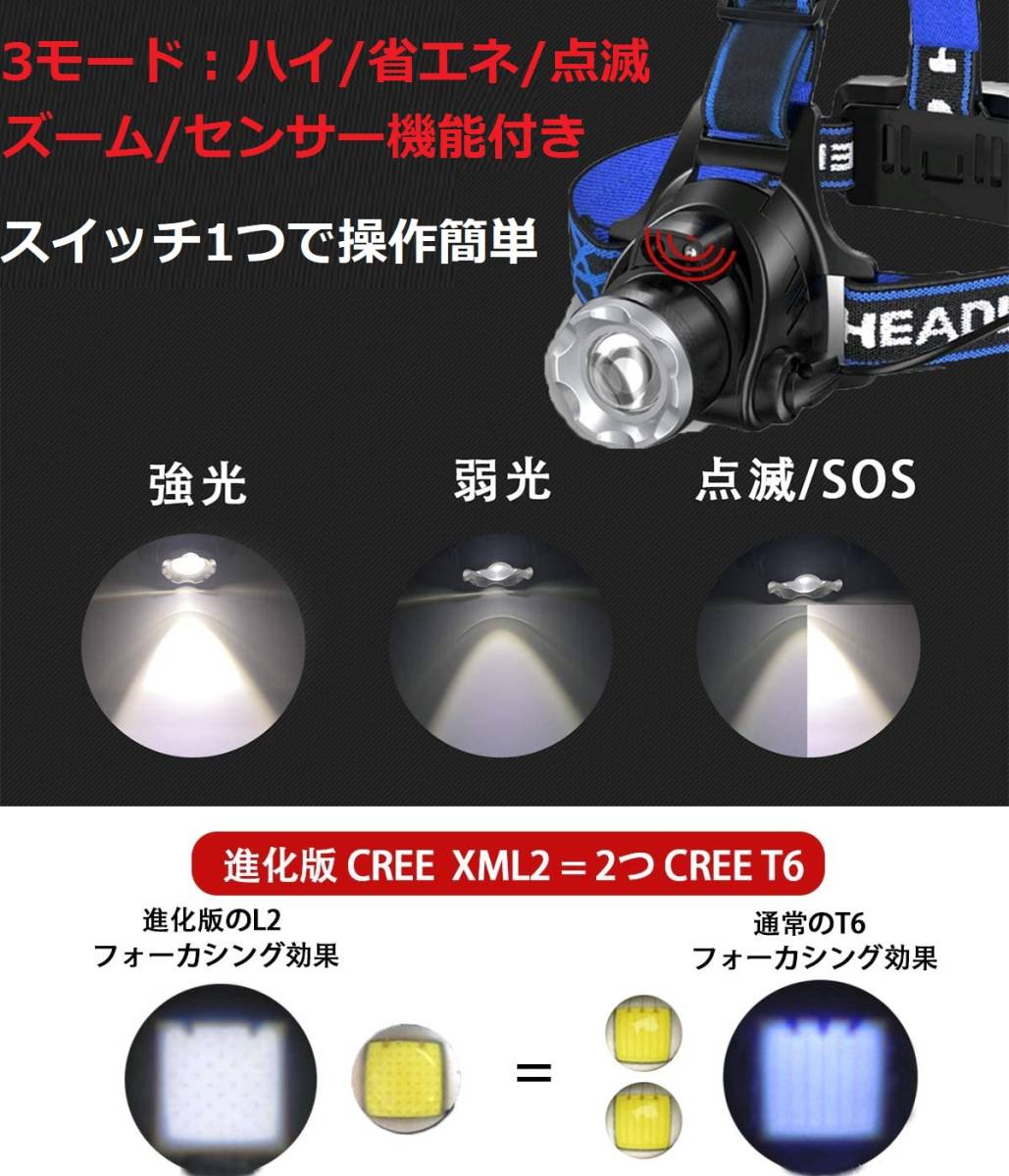 • 【ボディーセンサー搭載・超高輝度】ヘッドライトはセンシング機能が搭載しますので、手の動きを感知して点灯/消灯が可能です。ヘッドライトは最先端の米CREE XM-L T6 LED 高輝度チップが3枚搭載し、光学凸レンズ、均一な発光、最強1800ルーメン達明るさ抜群です。照射距離は最大約300Mに達します。