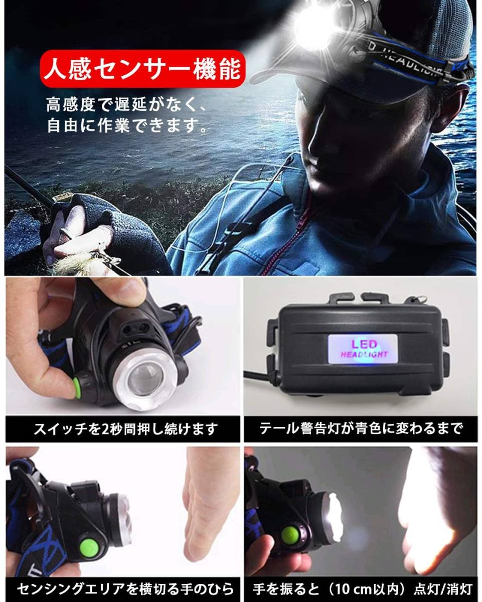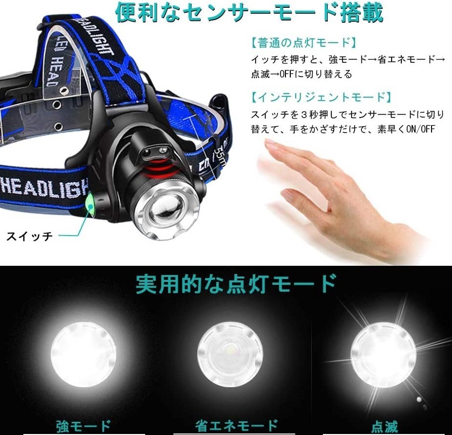 • 【3モードズーム・センサー機能】ヘッドライトは3つのモード(強・弱・点滅/SOS)があります。どのモードでも、スイッチを長押し続けるとセンサー機能がオンになり、手を振ると(10 cm以内)点灯/消灯でき、自由に作業できるようになります。後ろのバッテリーケースには安全赤ライトがついていますので、悪天候に安全仕事を確保できます。