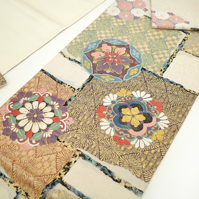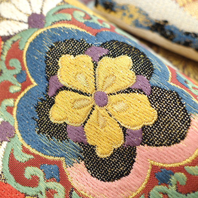 そこに、多彩なお色で華文や花菱・菊などが織り上げられています。