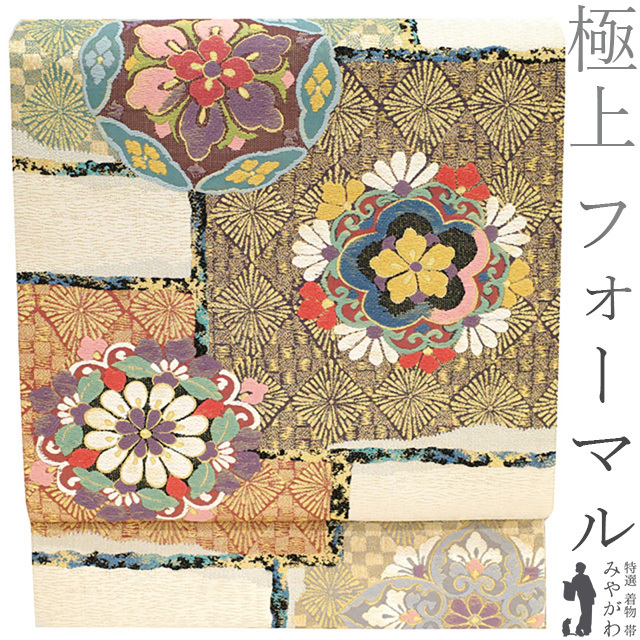 袋帯 京都 西陣 正絹 金糸 御寮典進 装束名錦文 白ベージュ 華文 花菱 菊 極上 フォーマル リサイクル 中古 仕立て上がり みやがわ sb52191