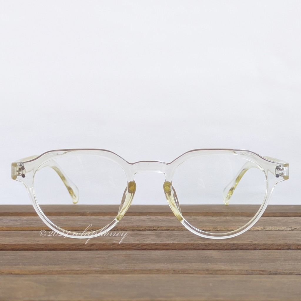 クリーミーなヴィンテージクリスタルカラーのフレームとシックなクリアレンズ