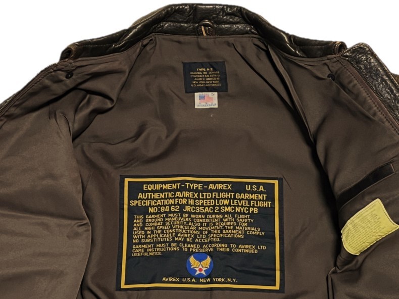 A-2フライトジャケットは、1930年前半に陸軍航空隊に採用、1944年以降、布製のB-10フライトジャケットに変更され生産は終了しましたが、多くの要望で1987年に空軍設立40周年として復刻しました。上質なラムスキンにアンティーク加工が施されたアイテムです。