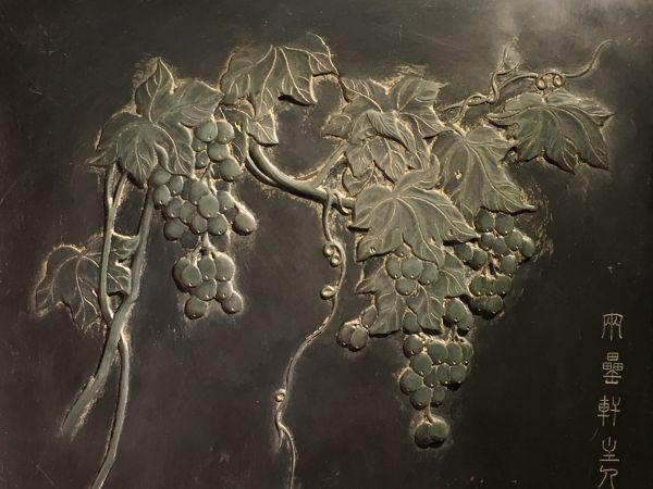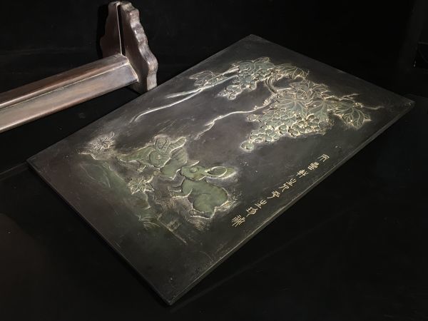 【瓏】端石彫 玉兎呈祥 碩果飄香文房硯屏 両罍軒主人銘 清時代 手彫り 文房四寶 書道具 中国古硯屏 骨董品 古美術 蔵出