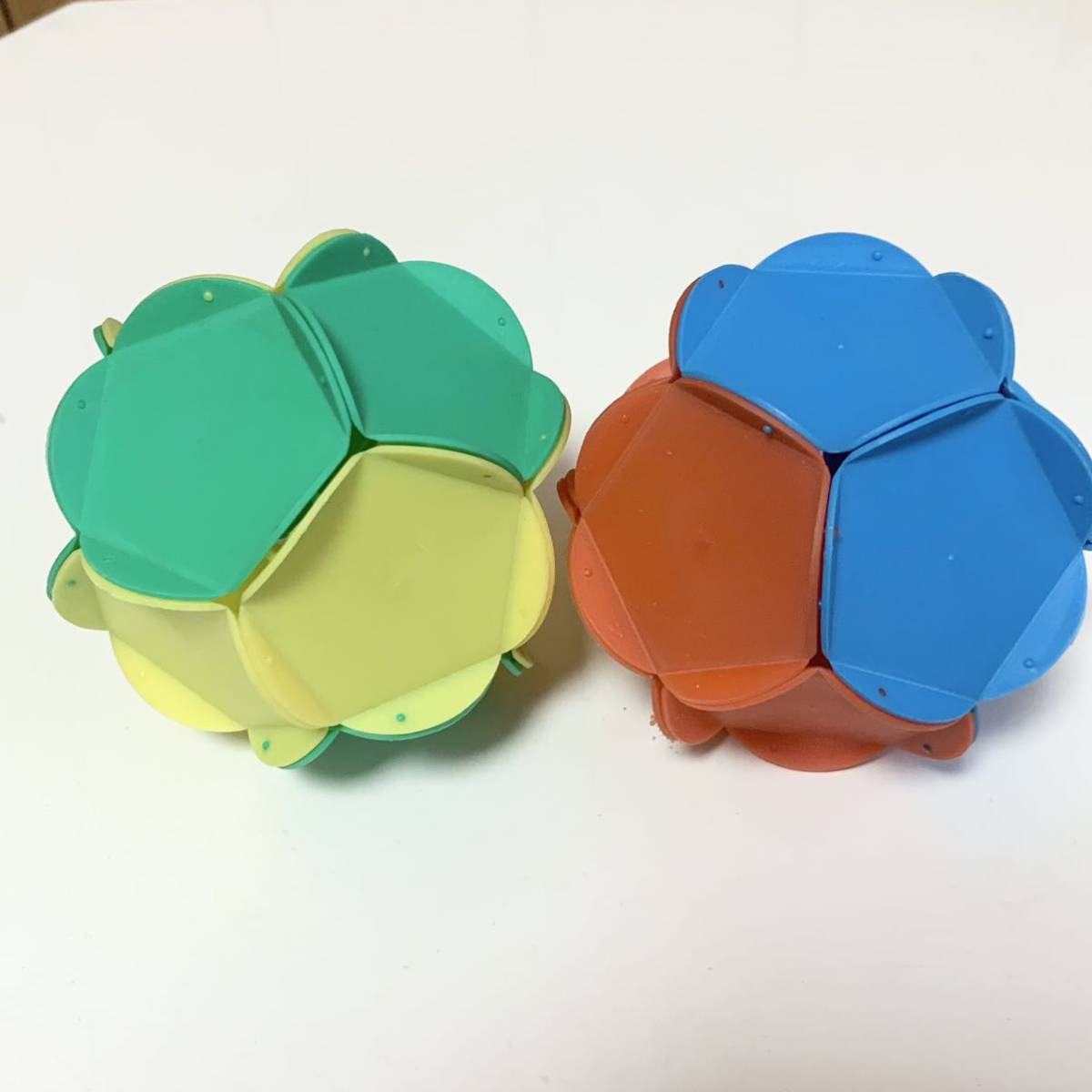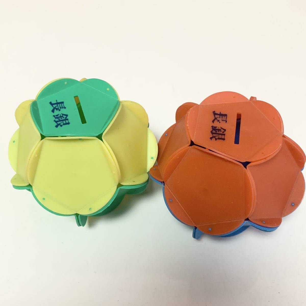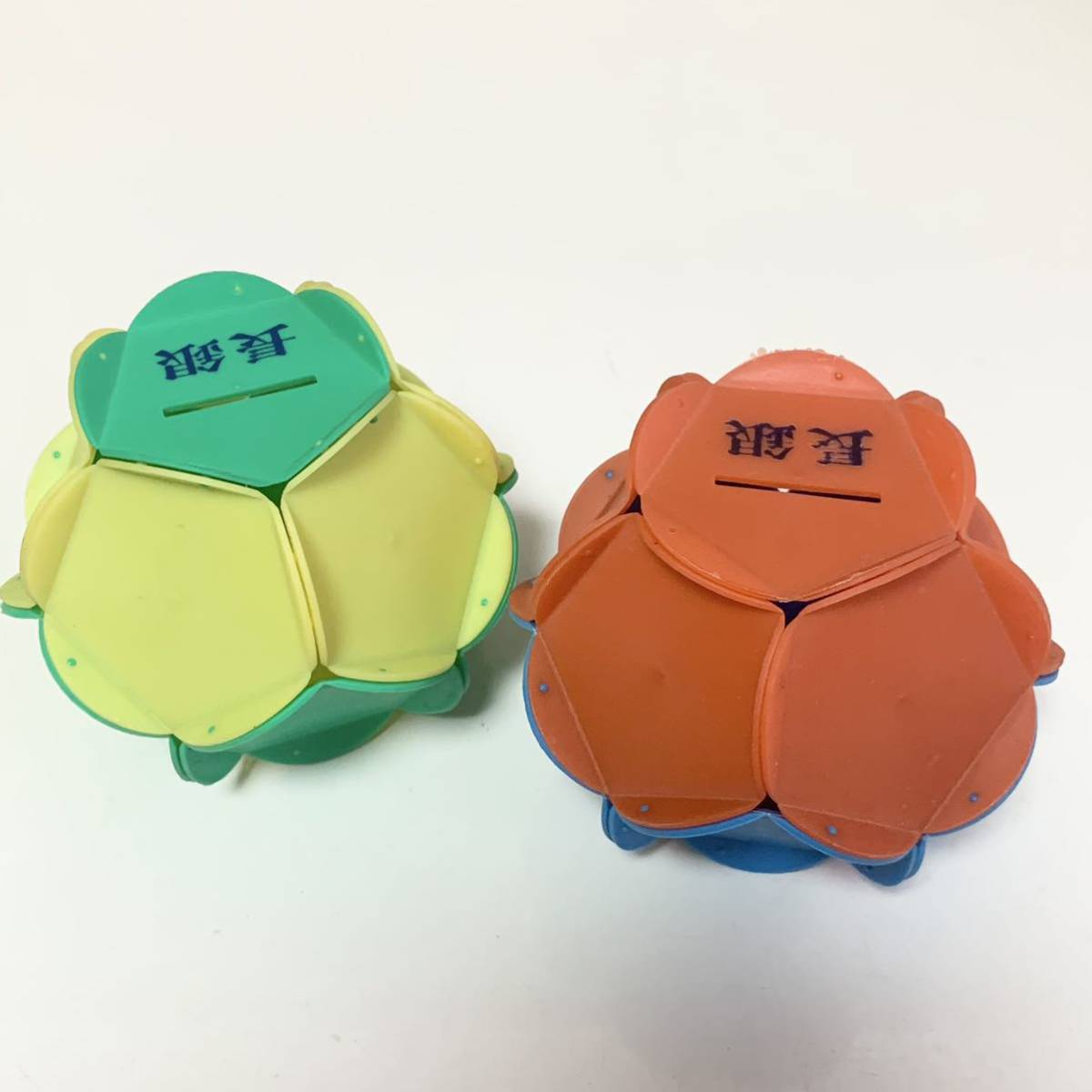 プラスチック製で、色が違う箇所が分かりやすいかと思いますが、そちらと同じ大きさのパーツを組み合わせて多面体のボール状になるように、パズルブロックのように組み合わせて組み立てられた貯金箱。