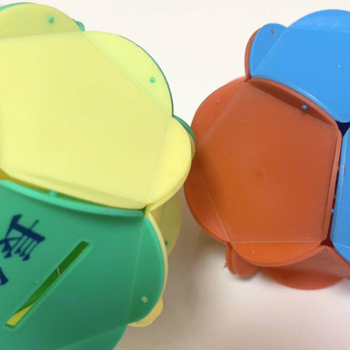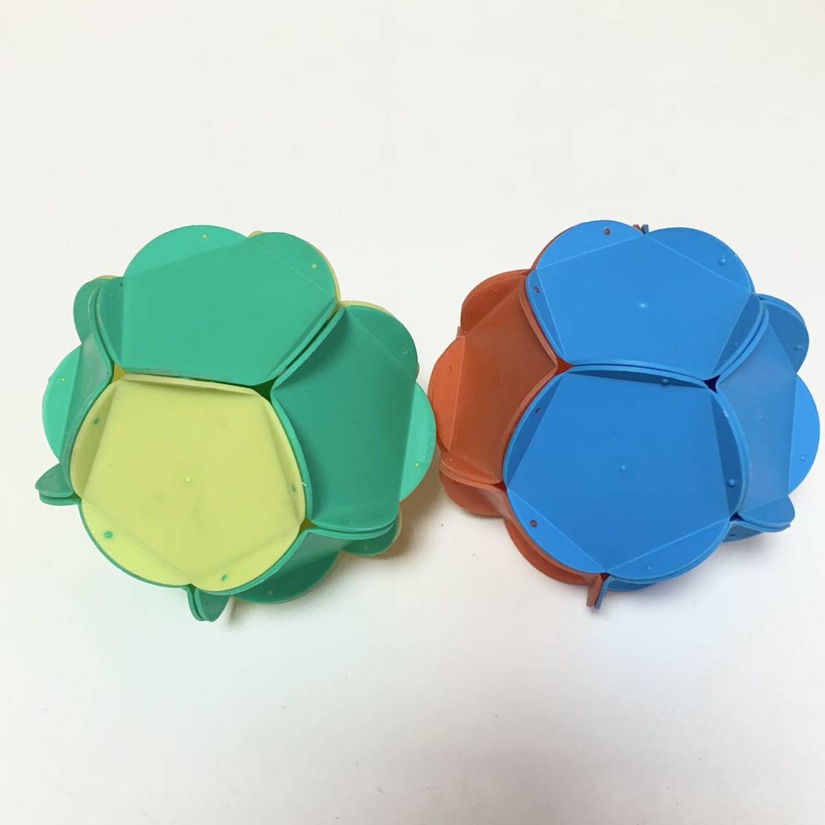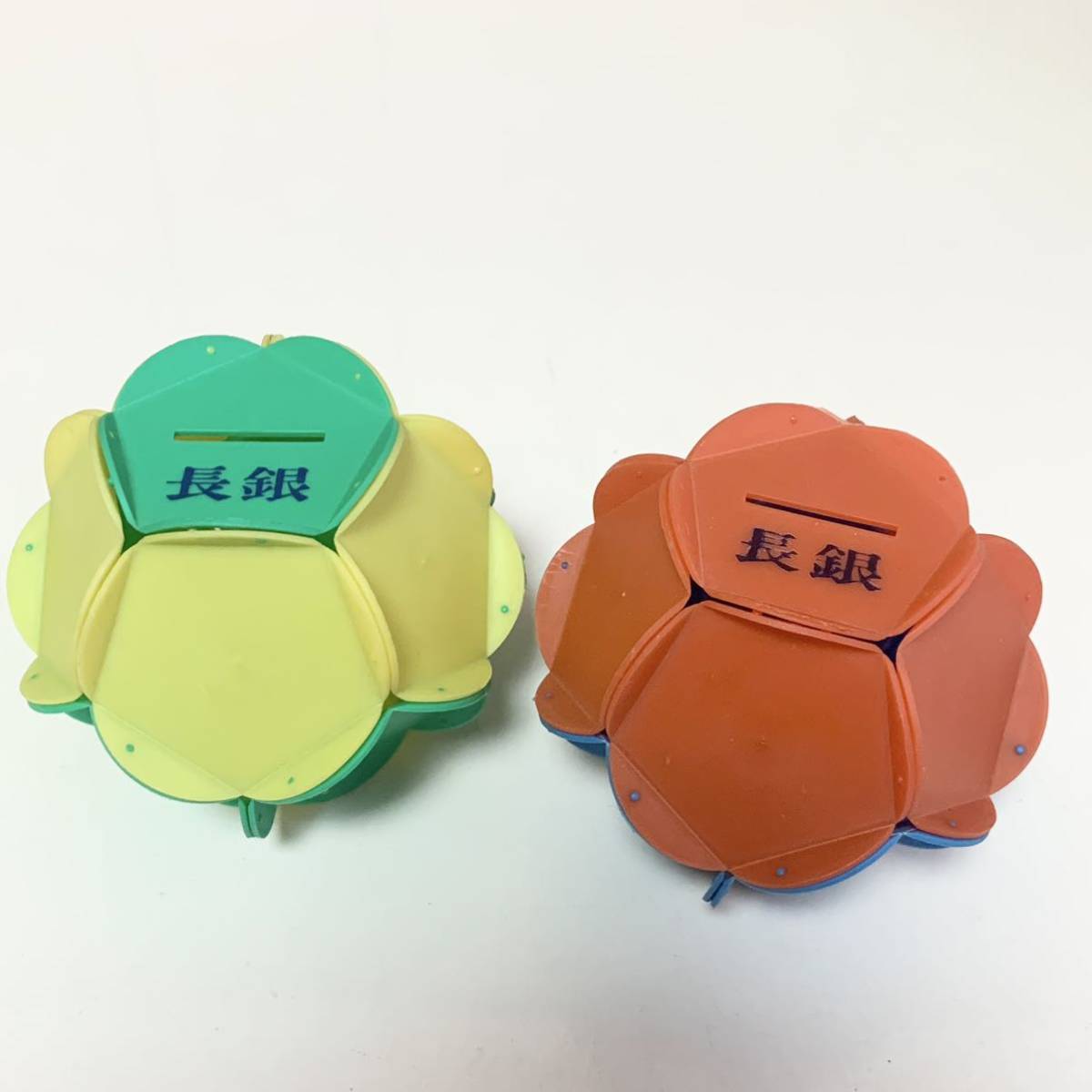 プラスチック製で、色が違う箇所が分かりやすいかと思いますが、そちらと同じ大きさのパーツを組み合わせて多面体のボール状になるように、パズルブロックのように組み合わせて組み立てられた貯金箱。