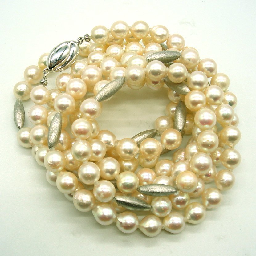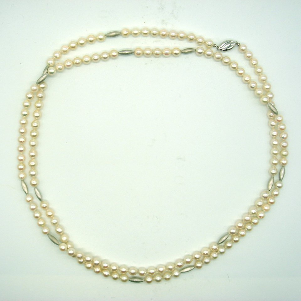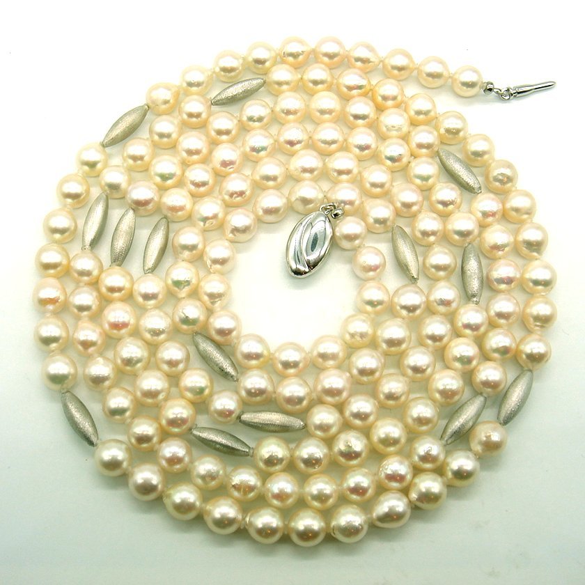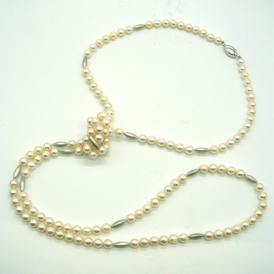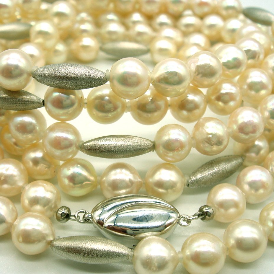 間々に細長いフットボール型のシルバーパーツが入ったカジュアルなあこやパールロングネックレス。