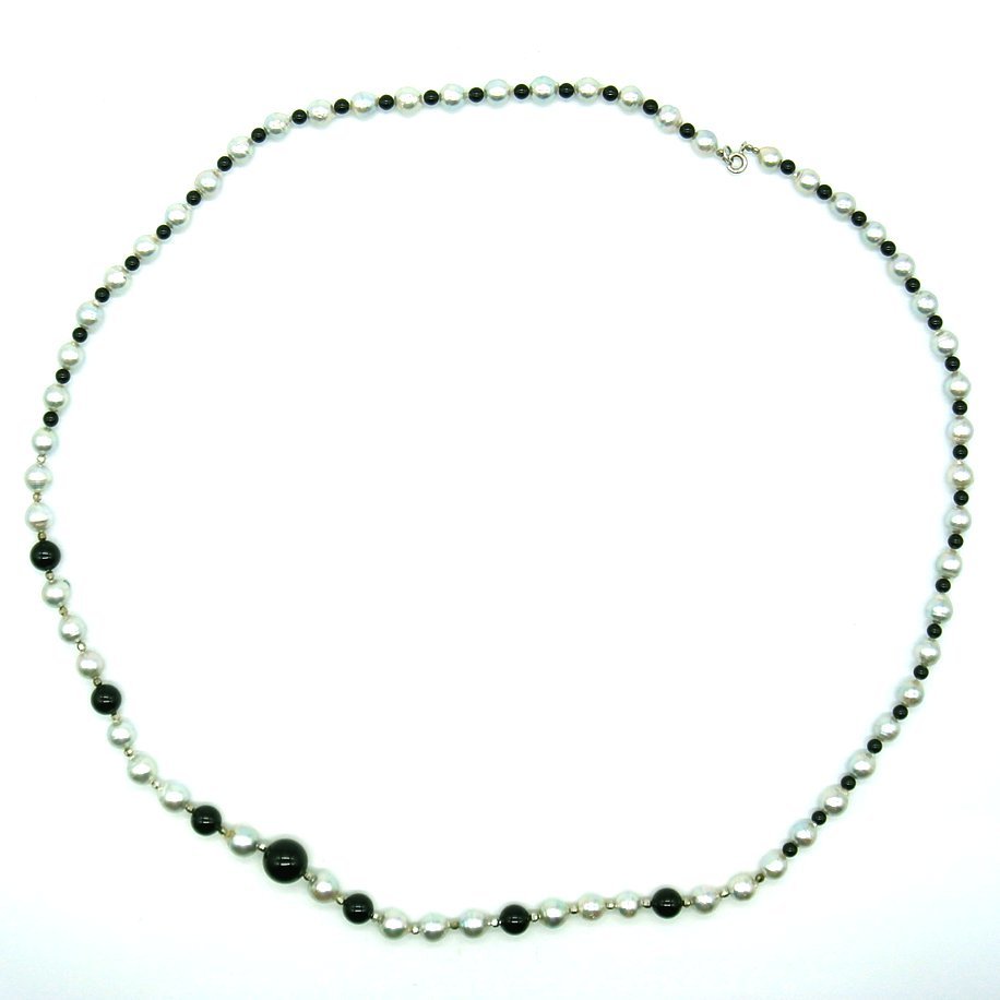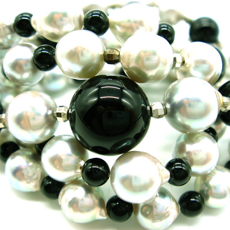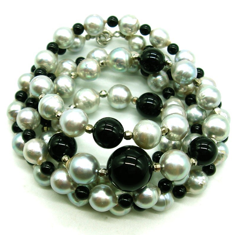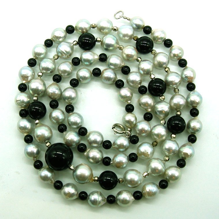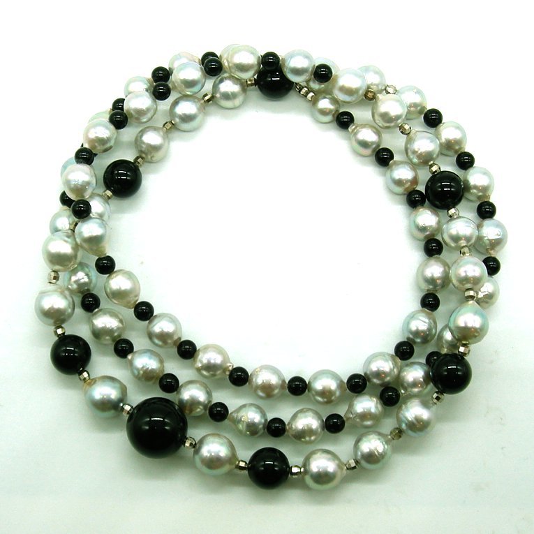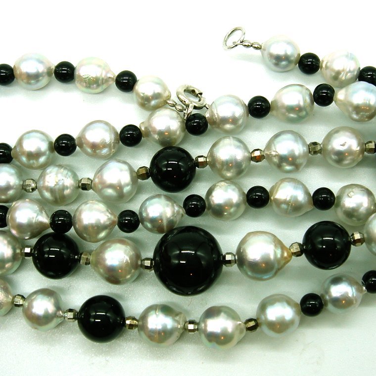 今時、プラスチックビーズのイミテーションでも結構な価格の中、天然の真珠とオニキスを使用してのこの価格は驚きです。