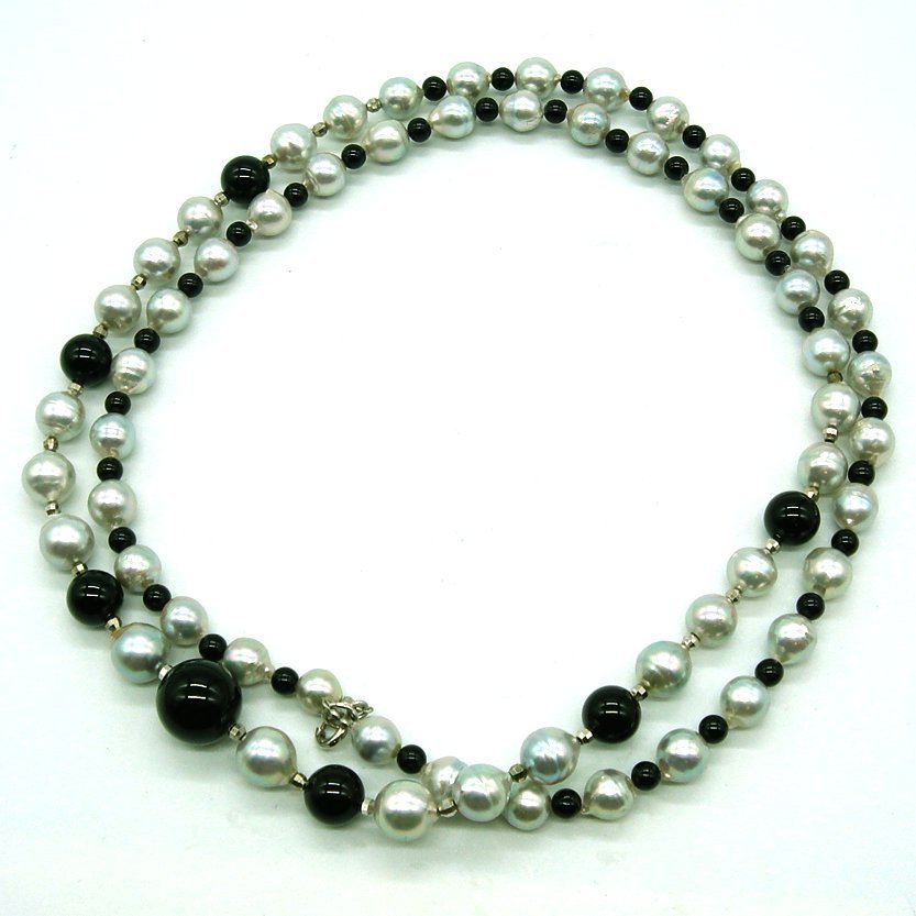 PL263:SV 調色あこや真珠(6.5-8mm) オニキス ロング(74cm) ネックレス