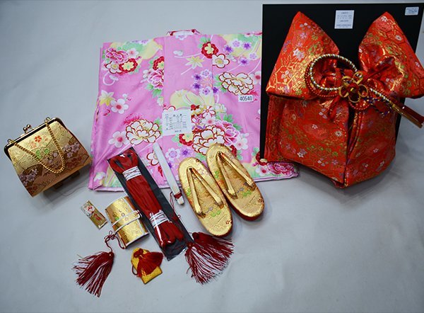 | 項目 | 七歳七五三祝着フルセット ・着物 ・長襦袢 ・結び帯 ・帯揚げ ・しごき ・帯締め ・伊達衿(縫付済) ・箱せこ ・草履 ・バッグ ・扇子 ・びら ・お守り |