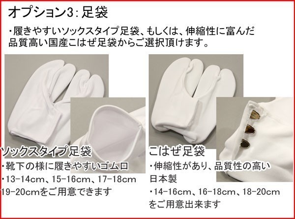 | 肌着 裾よけ 腰紐 足袋 | ■七歳着物用「肌着裾よけセット」も別途¥2800でご用意致します。 七歳用肌着裾よけセットのサイト ■腰紐も別途¥240(一本)でご用意致します。 ※腰紐の代わりになるようなもの、大人用の腰紐などお持ちであれば必要ございません。 ■足袋は2種類からご用意できます。 1.ソックスタイプの足袋:別途¥580 19~20cm 21~22cm 2.こはぜ付本格足袋(日本製):別途¥1500 19~20cm ※ご希望のお客様は、「フォーム備考欄」「メール(aji_net@khaki.plala.or.jp)」「お電話」「FAX」いずれかの方法でご連絡ください。 |