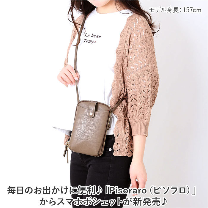 商品説明 | ・・毎日のお出かけに便利♪「Pisoraro(ピソラロ)」からスマホポシェットが新発売♪ ・【うれしいスリムサイズ】 ・ちょっとそこまでのお出かけにぴったりなサイズ感。旅行やレジャーシーンでも活躍☆ ・【スマホをサッと取り出し】 ・前面のフラップポケットは開閉がスムーズで、移動中もスマホをラクラク取り出せるのが嬉しい! ・【貴重品をひとまとめ】 ・メインルームにはカードポケット3つを装備。2ルーム構造になっておりお金や鍵・化粧小物など、サッとひとまとめ出来てミニマルスタイルにおすすめ。 ・【鍵が迷子にならない】 ・キーフック付きで迷子になりがちな鍵の定位置に。シーンに合わせて付け外しができるのもポイント。 ・【持ち方をアレンジ】 ・ショルダーストラップの長さを調節して、斜め掛けなど自分仕様に!ストラップを取り外してバッグインポーチとしても。 ・【エコバッグ付き】 ・コンビニでのお買い物に便利なエコバッグ付き。幅広いマチ構造でお弁当も入るサイズ感がポイント!使わないときはくるっとまとめてカバンにIN♪ ・【ポケット仕様】 ・メインルーム・・・カードポケット×3、ファスナーポケット×1 ・フロント・・・オープンポケット×1 ・背面・・・オープンポケット×1 |