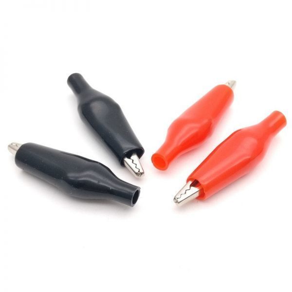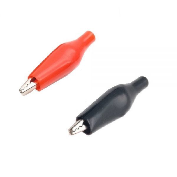 ・プラスチックカバー付きのワニ口クリップ(赤、黒)です。