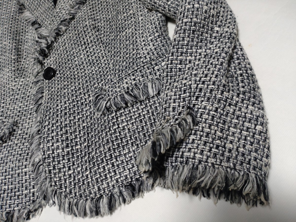 袖口や裾にフリンジがついた、ツィード風の華やかなスーツです。