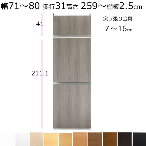 【特徴】上置きつっぱり機能付で天井高259~268cm(約)まで対応です。【本体外寸】幅71~80×奥行き31×高さ259~268cm(約)本体:幅71~80×奥行き31×高さ211.1cm(約)上置き突っ張り棚:幅71~80×奥行き31×高さ41cm(約)上置き突っ張り金具部分は7~16cm(約)【棚板枚数】8枚(棚板厚み2.5cmタフタイプ)棚は移動可能で穴から穴までの高さ(ピッチ)は1.5cm【幅の内寸】全体の幅サイズから3.6cmを引いた寸法となります。※側板(縦の両脇の板)の厚みは1.7cm【お詫び】特注のため、お届けまで10~14日かかります。送料込ですが、北海道・沖縄・離島は別途送料がかかります。【井崎店長から一言】<特別注文のため、ご注文後のサイズの変更、お取り消しがお受けすることが出来ません。サイズの確認を十分にお願いいたします。<BR>【お支払い方法について】</FONT>申し訳ございませんが、代金引換以外をお選びください。【色・主材】カラー12色/プリント紙化粧繊維板【生産国 】JAPAN※お客様組み立て商品です。(組み立て家具です)プラス・マイナスドライバー、ゴムハンマーのご用意をお願いいたします。