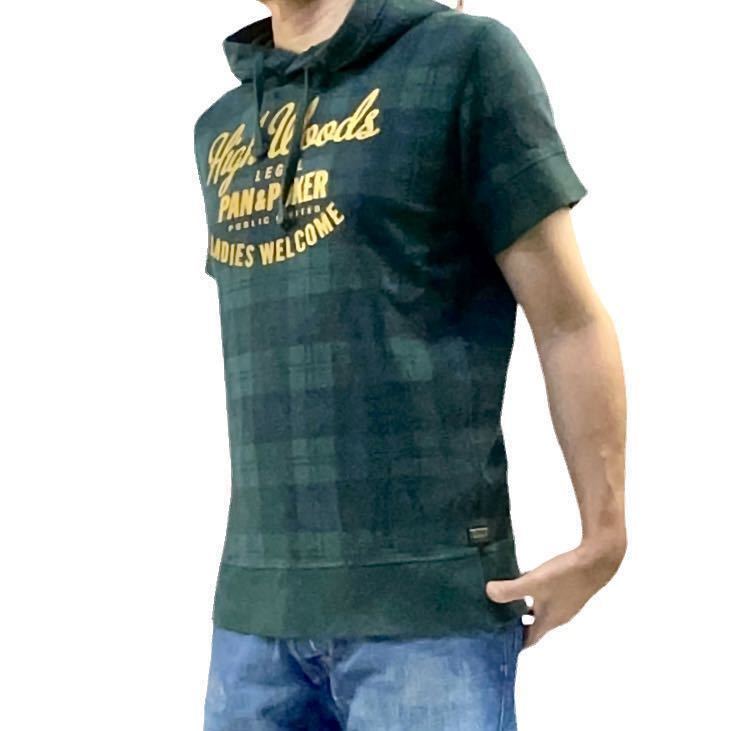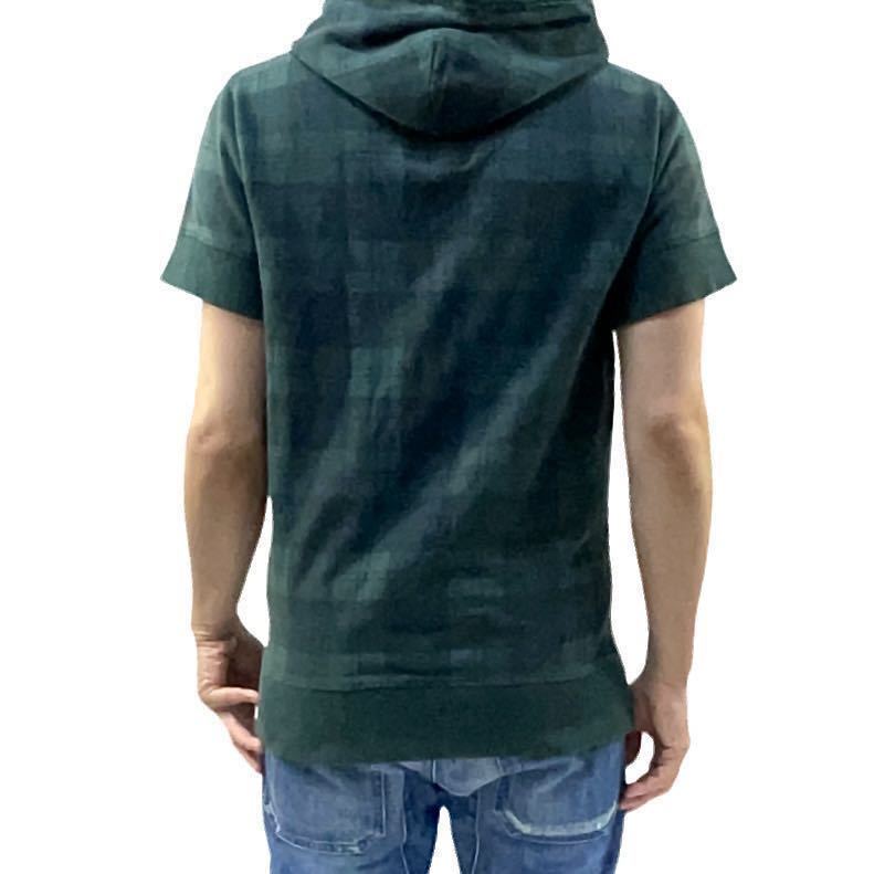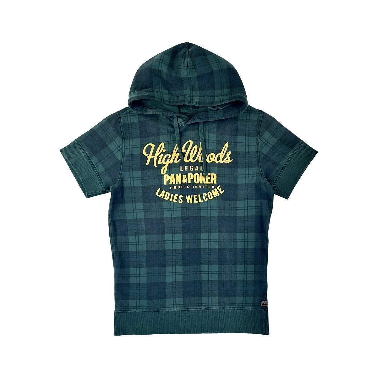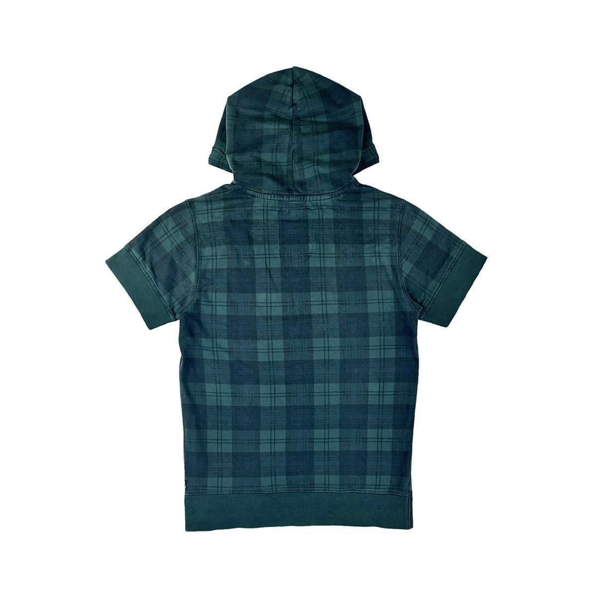 深みのある色味のチェック地にイエローのカッティングプリントのコントラスト配色がキャッチーな半袖パーカー。