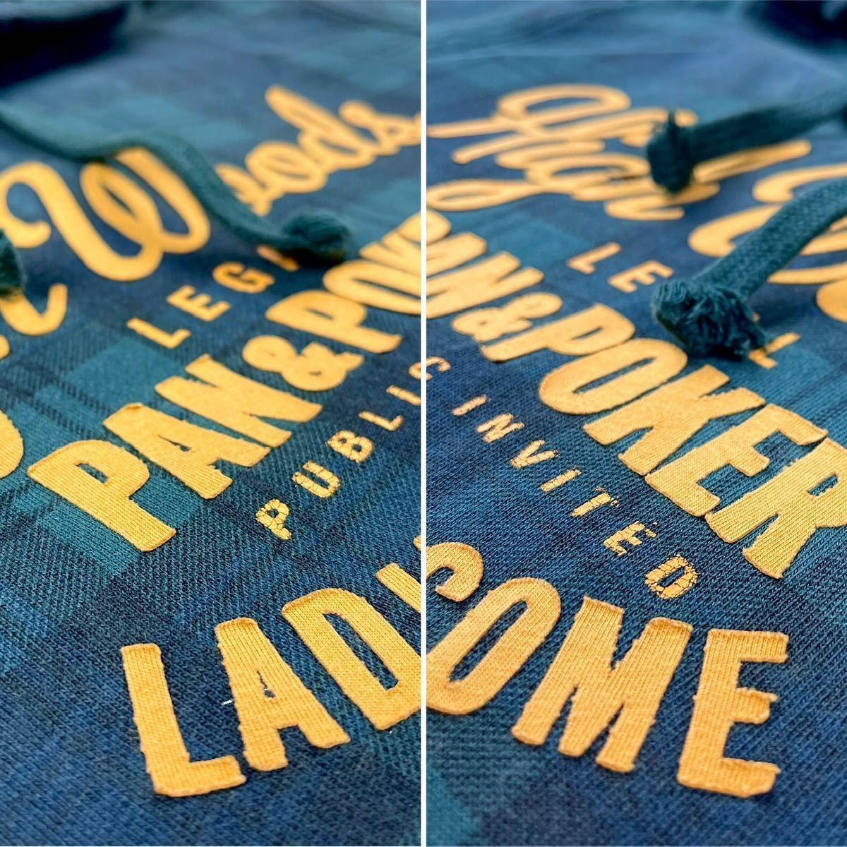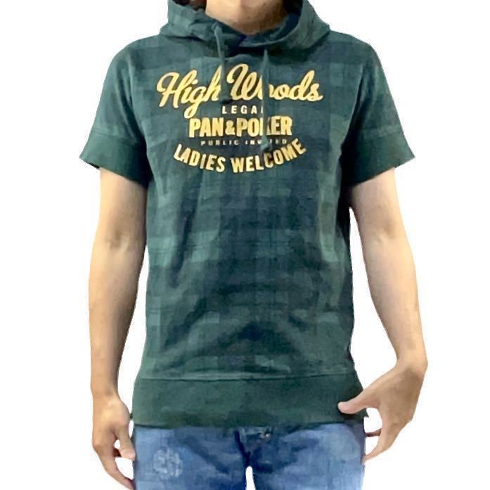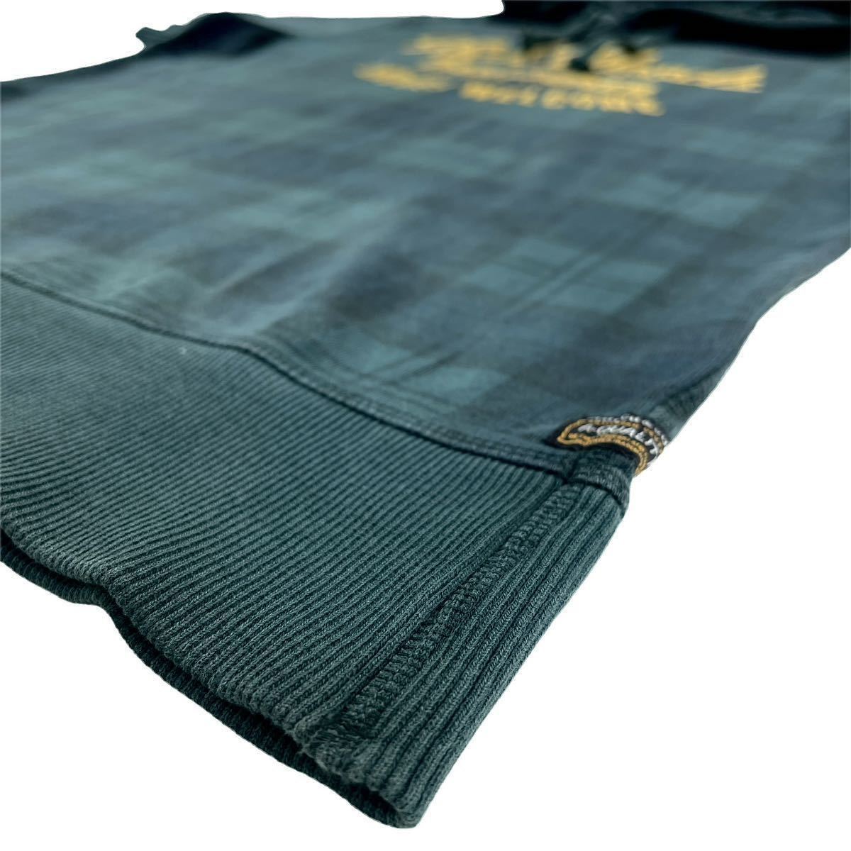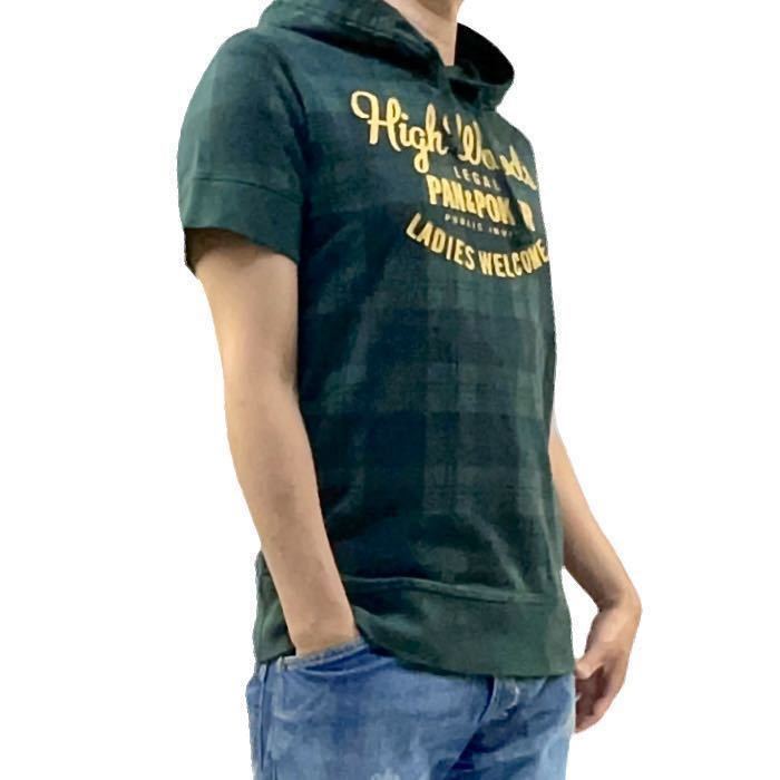 深みのある色味のチェック地にイエローのカッティングプリントのコントラスト配色がキャッチーな半袖パーカー。