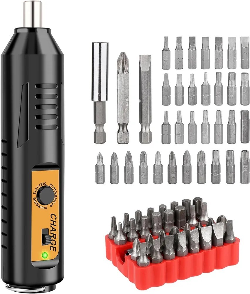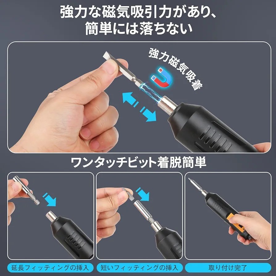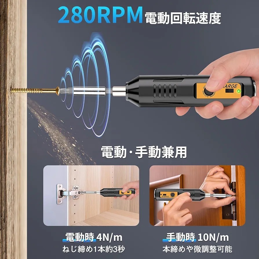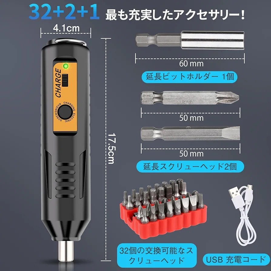 2023年最新型】電動ドライバー 小型 電動ドリル 国際標準型ビット32本+ 2本延長ビット 3.7V 4N.m 正逆転切替2000mAh大容量USB充電式 急速充電 連続使用時間90分 手動兼用 DIY 家具組立 軽量 初心者対応 ビット延長アダブター1本 & 収納ケース & 日本語取扱説明書付き