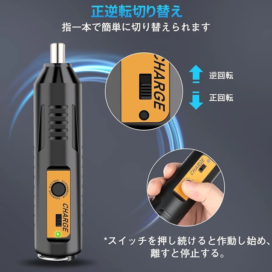 【正転・逆転切り替え機能】この電動ドライバーは、作業の柔軟性を高めるために正転・逆転切り替え機能を備えています。これにより、ネジの締め付けから緩めるまで、さまざまな作業に対応できます。具体的には、正転の際にはネジをしっかりと締め付け、逆転に切り替えることでネジを緩めることが可能です。この機能により、作業のスピードと効率が向上し、時間を節約しながら効果的に作業を進めることができます。注:丸いボタンを押し続けるとスタートし、離すとストップします。
