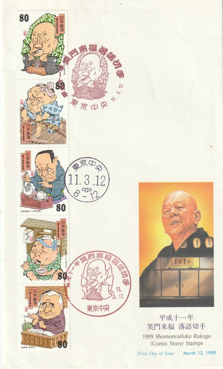 FDC 1989年  平成十一年  笑門来福 落語切手  80円5貼3消し 2種  絵深田明弘ーNCC