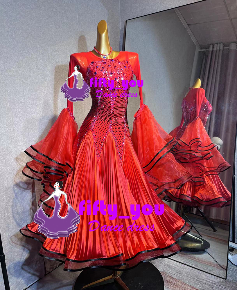新品fifty_youオリジナル高級衣装 セミオーダードレス レディース社交ダンスドレス モダン競技ドレス 存在感があるフロート 赤色