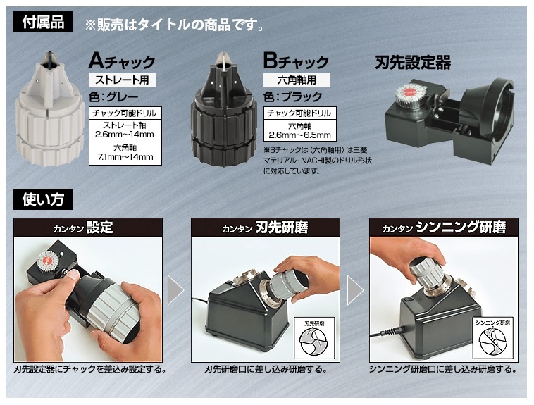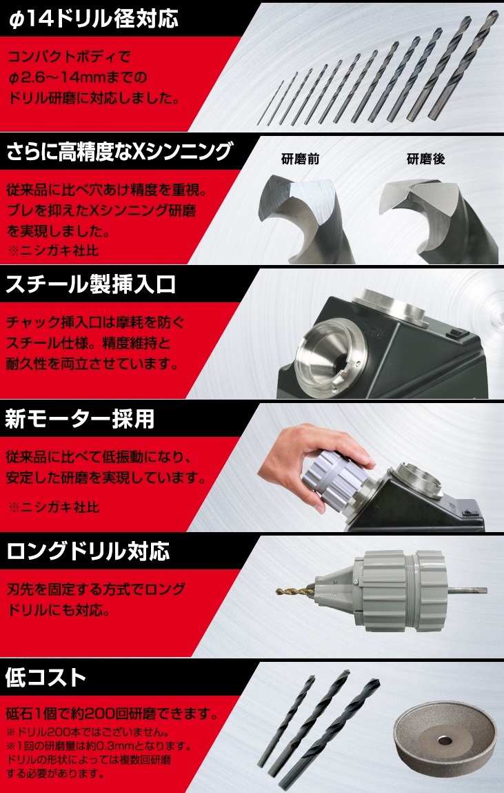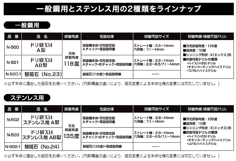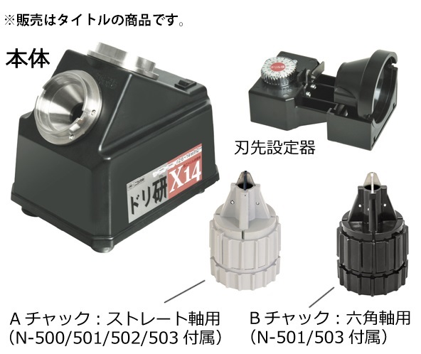ニシガキドリ研X14 Aチャック ステンレス用N-502■特長・刃先の設定後、研磨機本体に差し込むだけで研磨できます。・X型シンニング研磨ができます。■仕様・鉄工用ストレートドリル:2.6~14mm・鉄工用六角軸ドリル:7.1~14mm