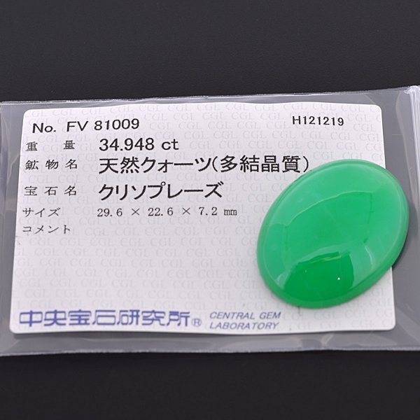 | E【BSJD】天然クォーツ(多結晶質) クリソプレーズ 34.948ct ルース 29.6×22.6×7.2mm 裸石 中央宝石研究所 ソーティング付 本物 | ||||