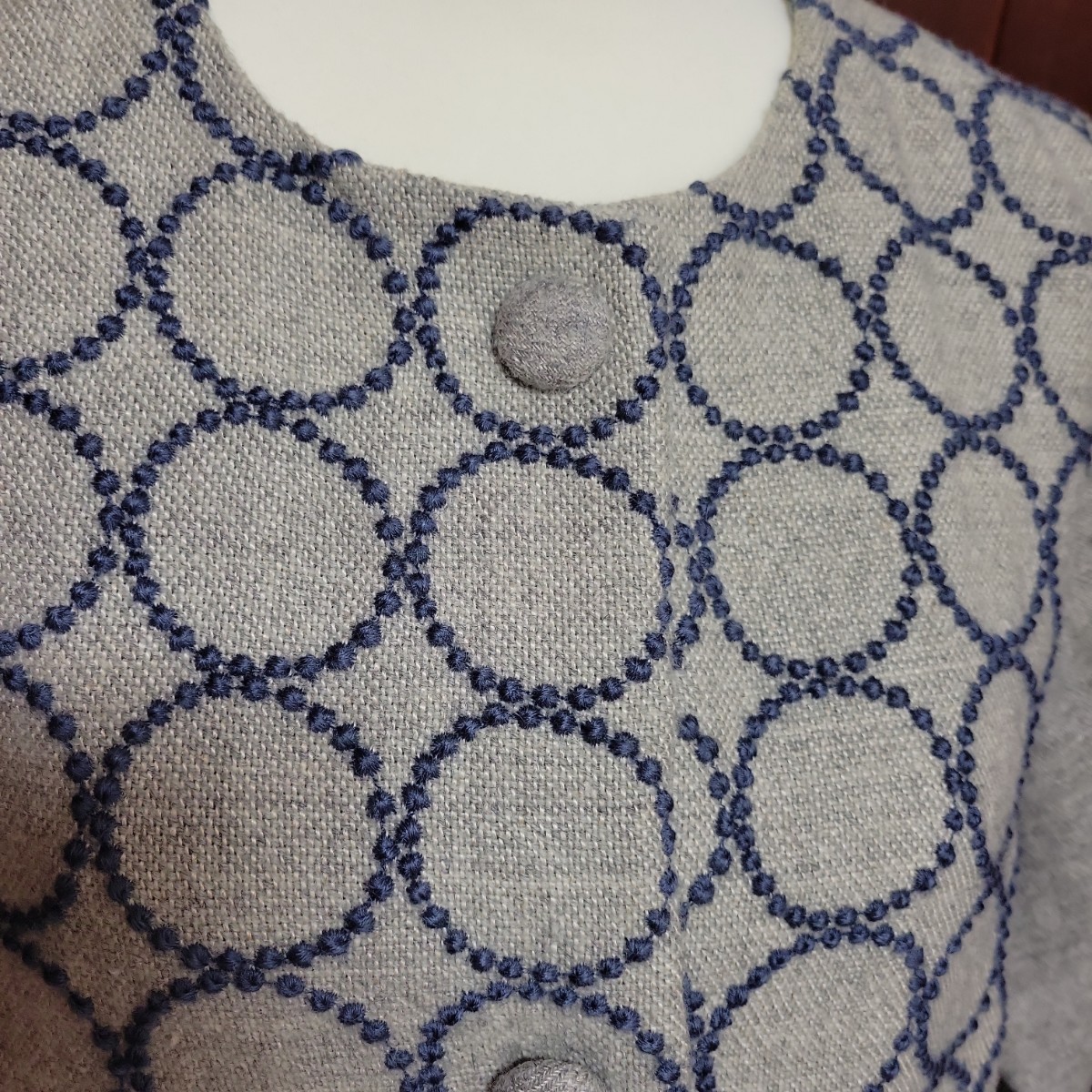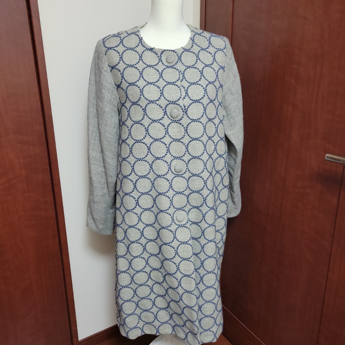 前身頃と後ろ身頃の全体にミナペルホネン タンバリンの生地を贅沢に使用したロングコートです。